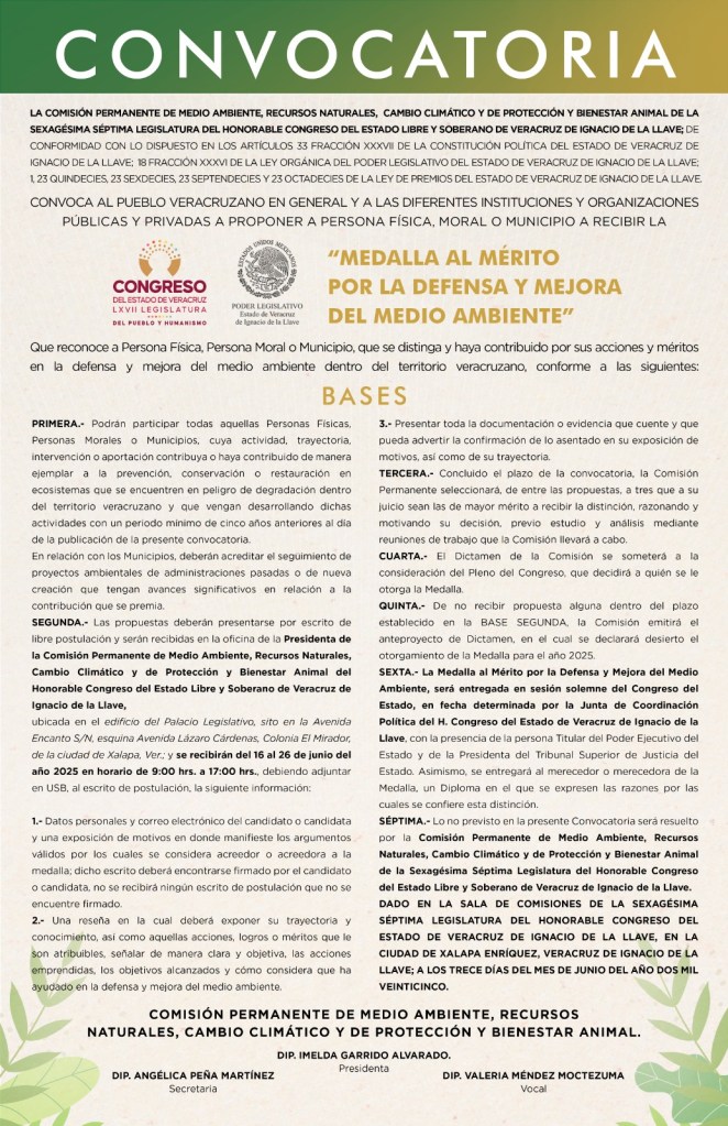 Xalapa, Ver., 17 de junio de 2025.- La Comisión Permanente de Medio Ambiente, Recursos Naturales, Cambio Climático y de Protección y Bienestar Animal de la LXVII Legislatura emitió la convocatoria para el otorgamiento de la medalla al Mérito por la Defensa y Mejora del Medio Ambiente 2025, distinción que entrega anualmente el Congreso del Estado para reconocer las acciones en favor del medio ambiente.