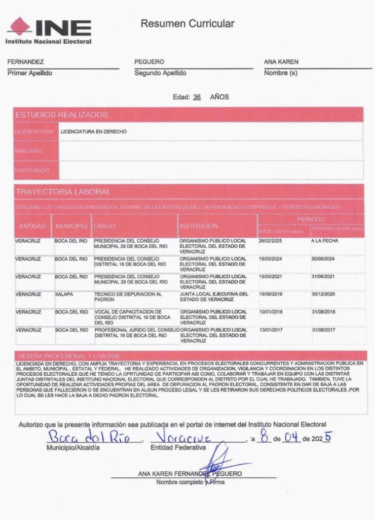 Y en este año 2025 fungió como a Presidenta del Consejo Municipal #29 del OPLE en Boca del Río, para volver a hacer ganar a Gamboa Torales ahora por la Alcaldía.