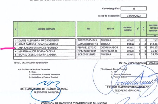 La consejera presidenta del Consejo Municipal #29 del OPLE de Boca del Río, Ana Karen Fernández Peguero cobró más de $100 mil pesos al mes en el ayuntamiento de Boca del Río en los años 2022-2023, a cargo de Juan Manuel Unanue.