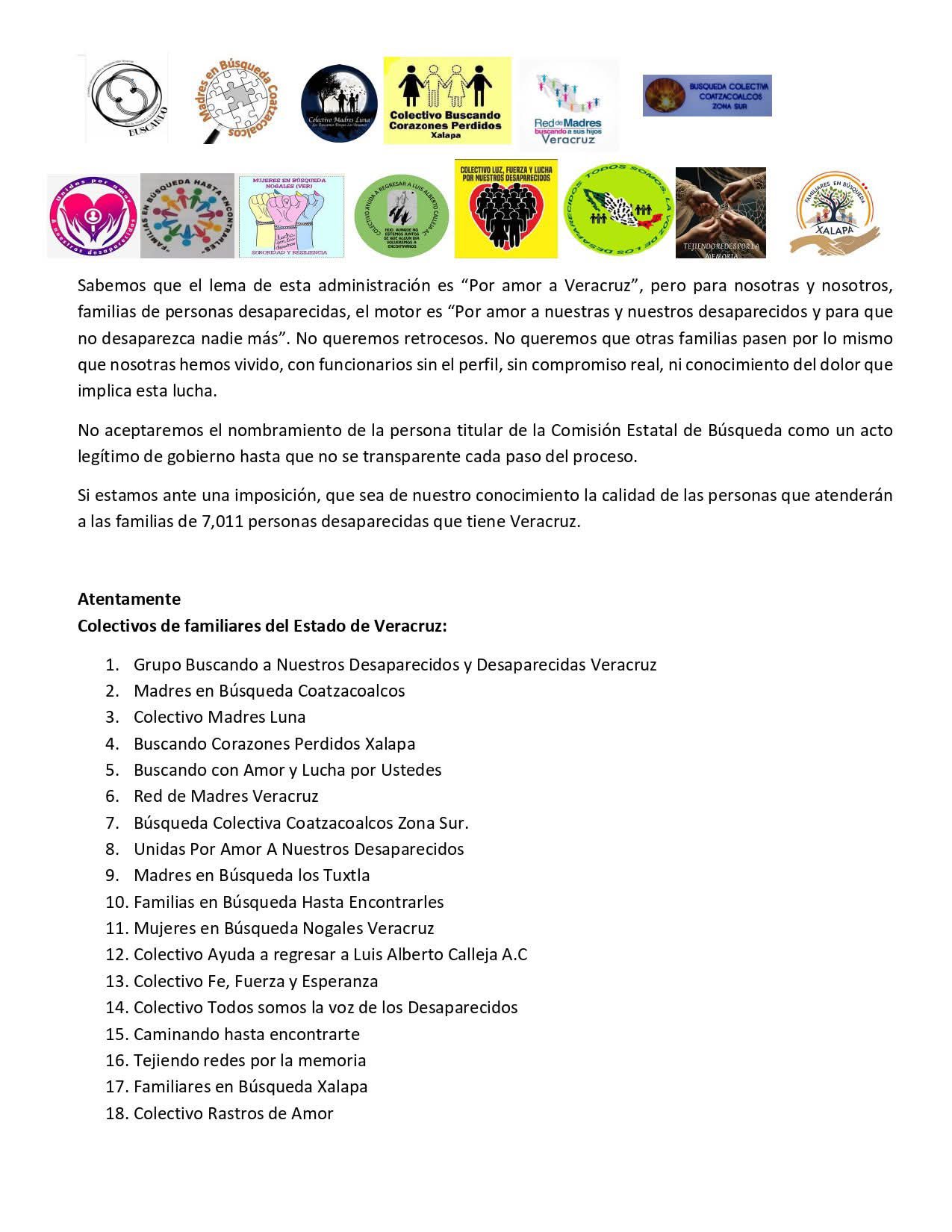 RECHAZAN COLECTIVOS DE COATZACOALCOS LA DESIGNACIÓN DEL TITULAR DE LA COMISIÓN ESTATAL DE BÚSQUEDA EN VERACRUZ