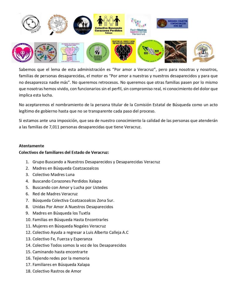 “Sabemos que el lema de esta administración es ‘Por amor a Veracruz’, pero para nosotras y nosotros el motor es ‘Por amor a nuestras y nuestros desaparecidos, y para que no desaparezca nadie más’”, sentenciaron.