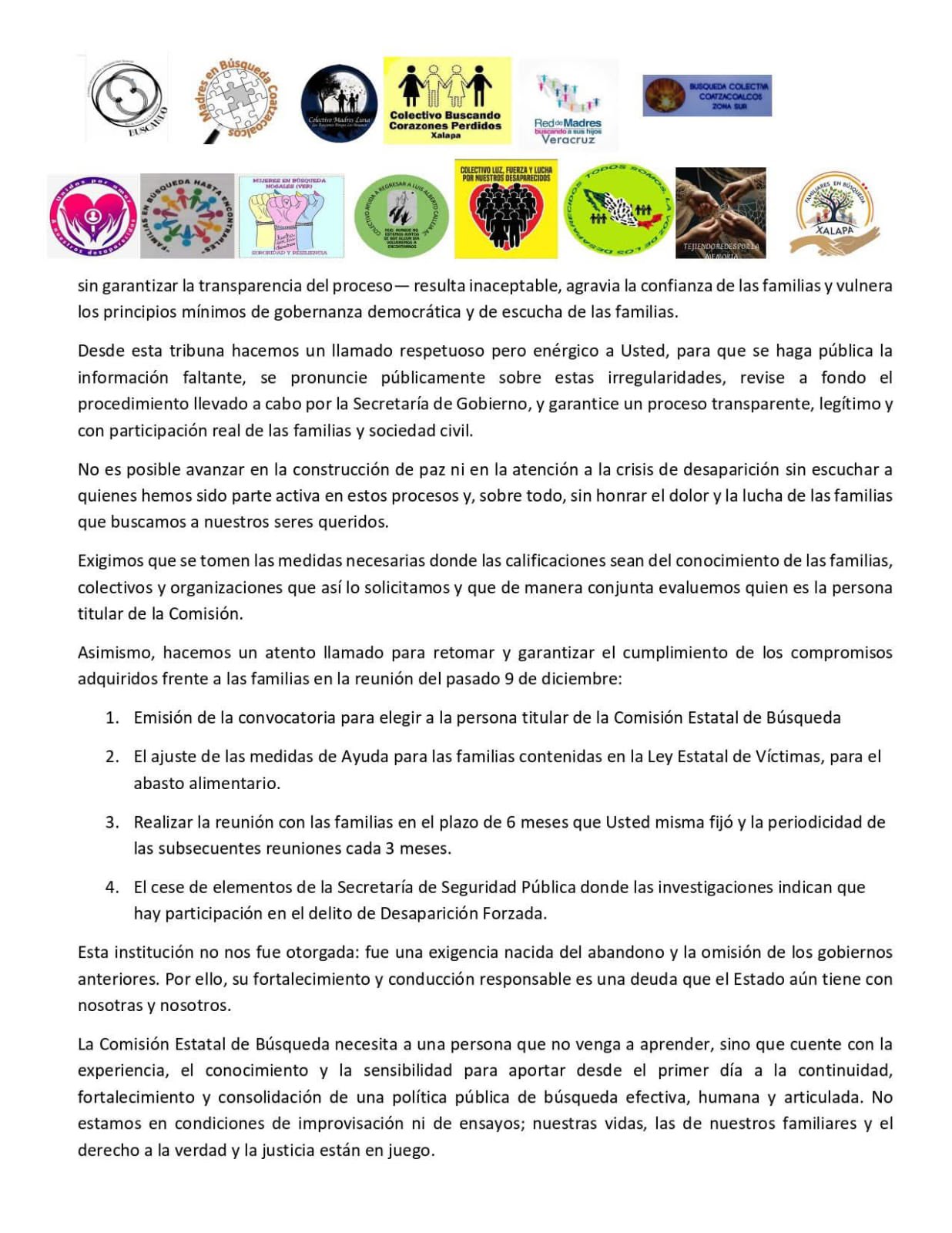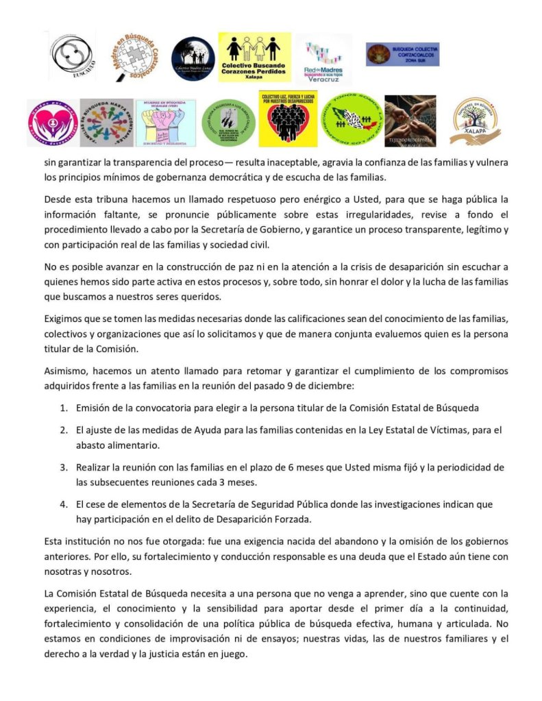 “Necesitamos a una persona que no venga a aprender, sino que cuente con el conocimiento, la trayectoria y el compromiso necesario para dar continuidad y fortalecer el trabajo que exige esta labor”, expresaron. Asimismo, recalcaron que la lucha que sostienen no admite ensayos ni errores, pues está en juego la vida de sus seres queridos y el derecho a la verdad y la justicia.