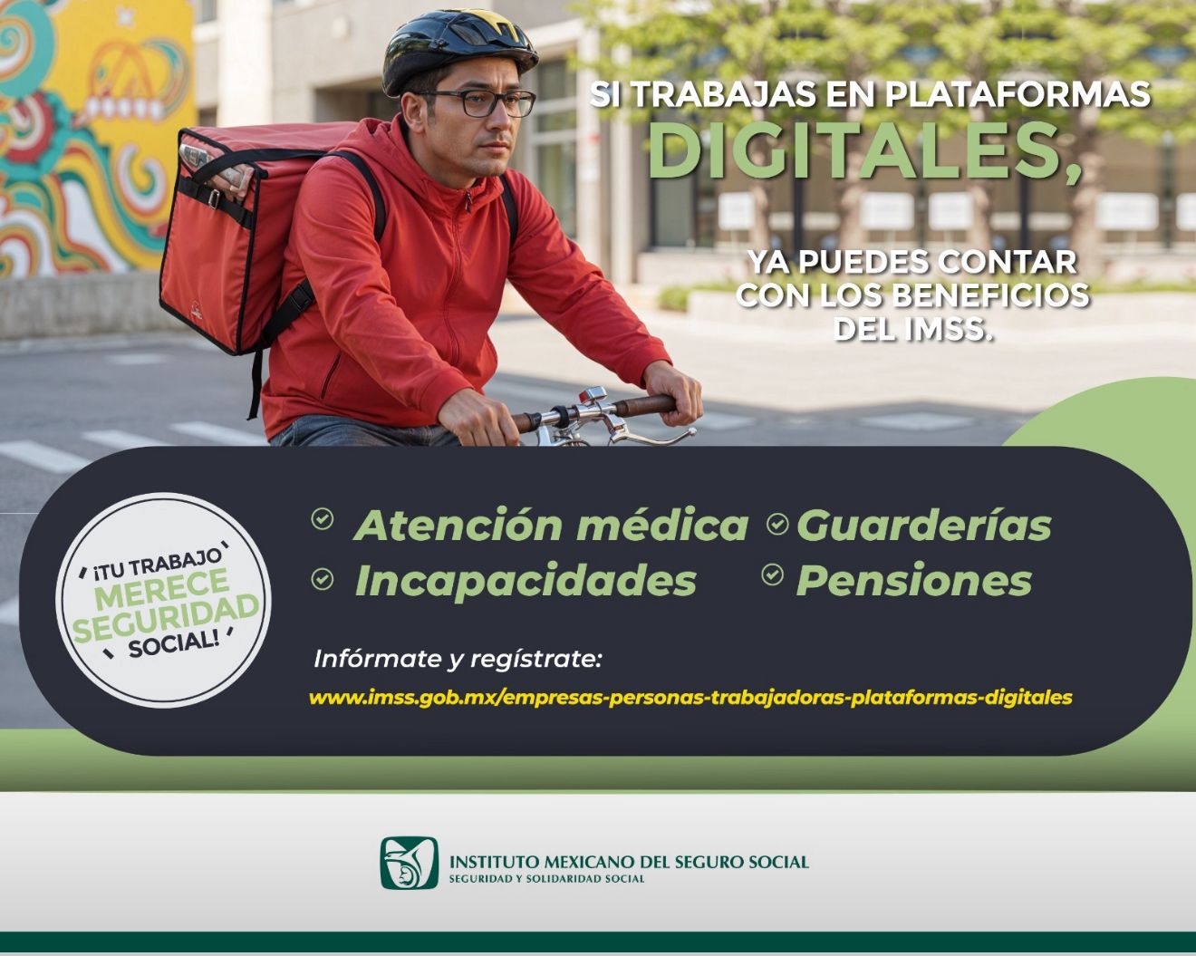 El titular de la Jefatura de Afiliación y Cobranza, doctor Erick Sánchez Lucho, comentó que de acuerdo a lo publicado el 24 junio en el Diario Oficial de la Federación, el primero de julio de 2025 inicia la operación de la Prueba Piloto para la inscripción en el IMSS de las personas trabajadoras de plataformas digitales, a partir de esta fecha las empresas de plataformas digitales tienen la obligación de incorporar al Régimen Obligatorio del Seguro Social, a los trabajadores de dichas plataformas como: choferes, repartidores y operadores de servicios, es decir, a aquellas personas que prestan servicios en favor de terceros a través de una aplicación o plataforma digital para: