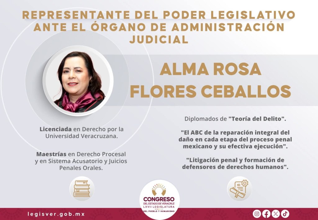 Xalapa, Ver., 04 de julio de 2025.- En sesión extraordinaria y con 40 votos a favor, el Pleno de la LXVII Legislatura designó a la ciudadana Alma Rosa Flores Ceballos como representante del Poder Legislativo ante el Órgano de Administración Judicial, en vista de que cumple con los requisitos establecidos en el artículo 62 de la Constitución Política local y por la experiencia adquirida a lo largo de su carrera en el Poder Judicial estatal.