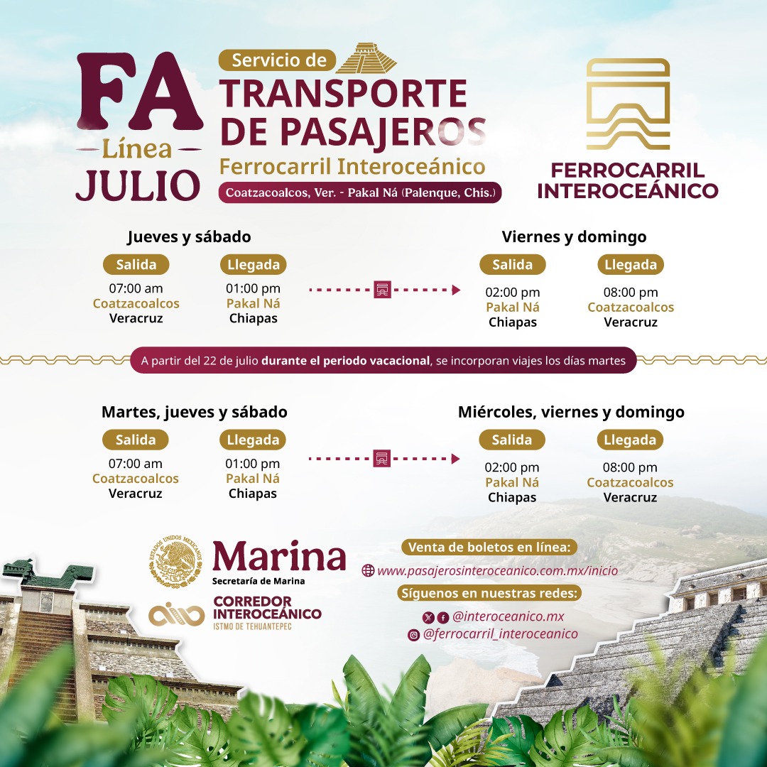 Con motivo de la temporada vacacional de verano, el Ferrocarril del Istmo de Tehuantepec incrementará su servicio de pasajeros en las líneas Z y FA, al añadir salidas los días martes y miércoles a partir del 22 de julio.