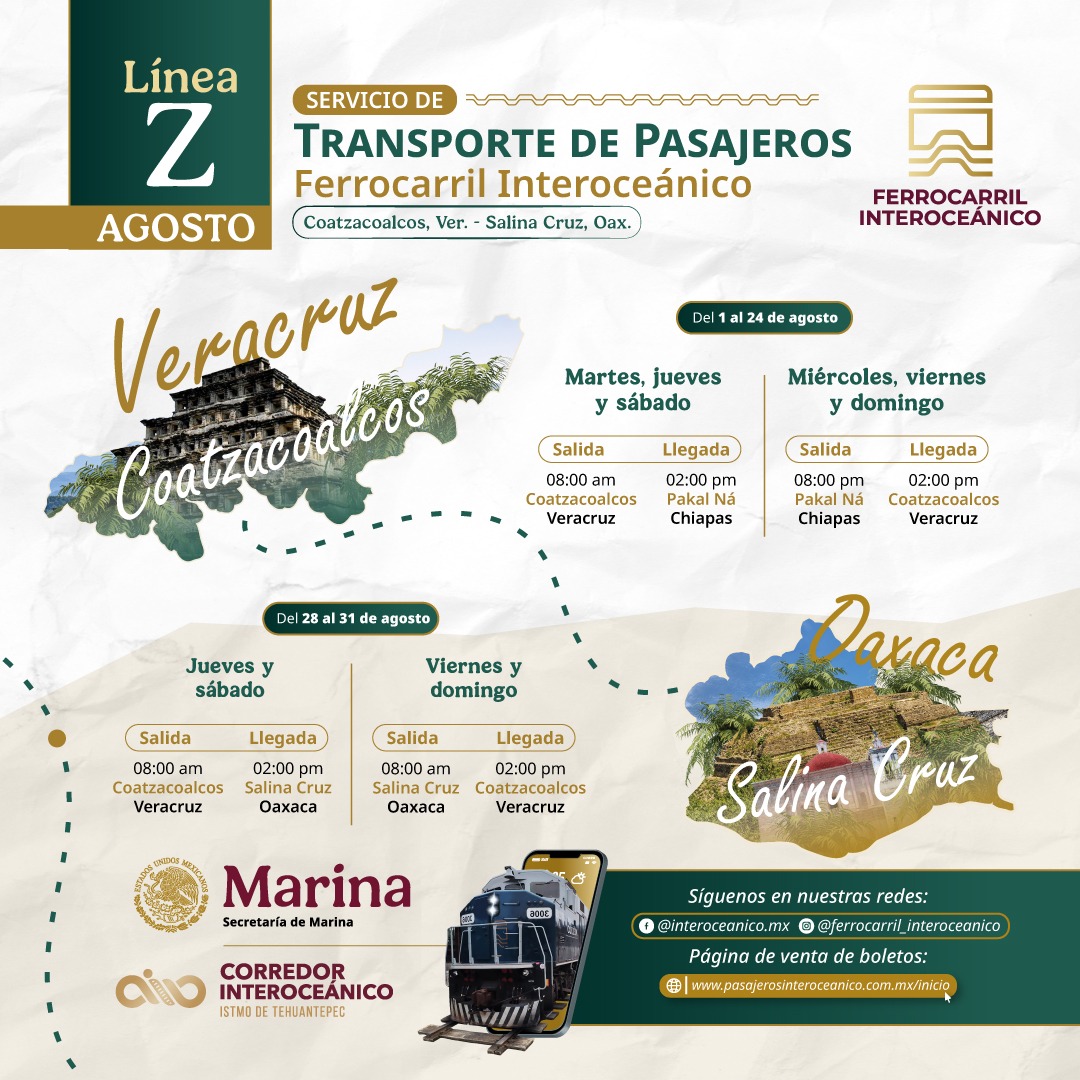 En la línea Z, los trenes saldrán los jueves y sábados desde Coatzacoalcos a las 8:00 horas, llegando a Salina Cruz a las 14:00 horas.