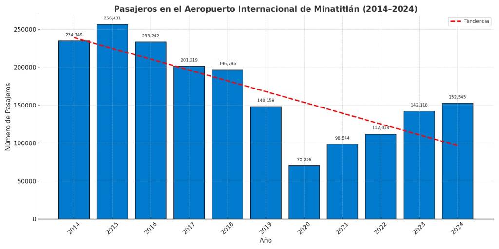 Aquí tienes las cifras de pasajeros que movilizó el Aeropuerto Internacional de Minatitlán operado por ASUR en los últimos 10 años: