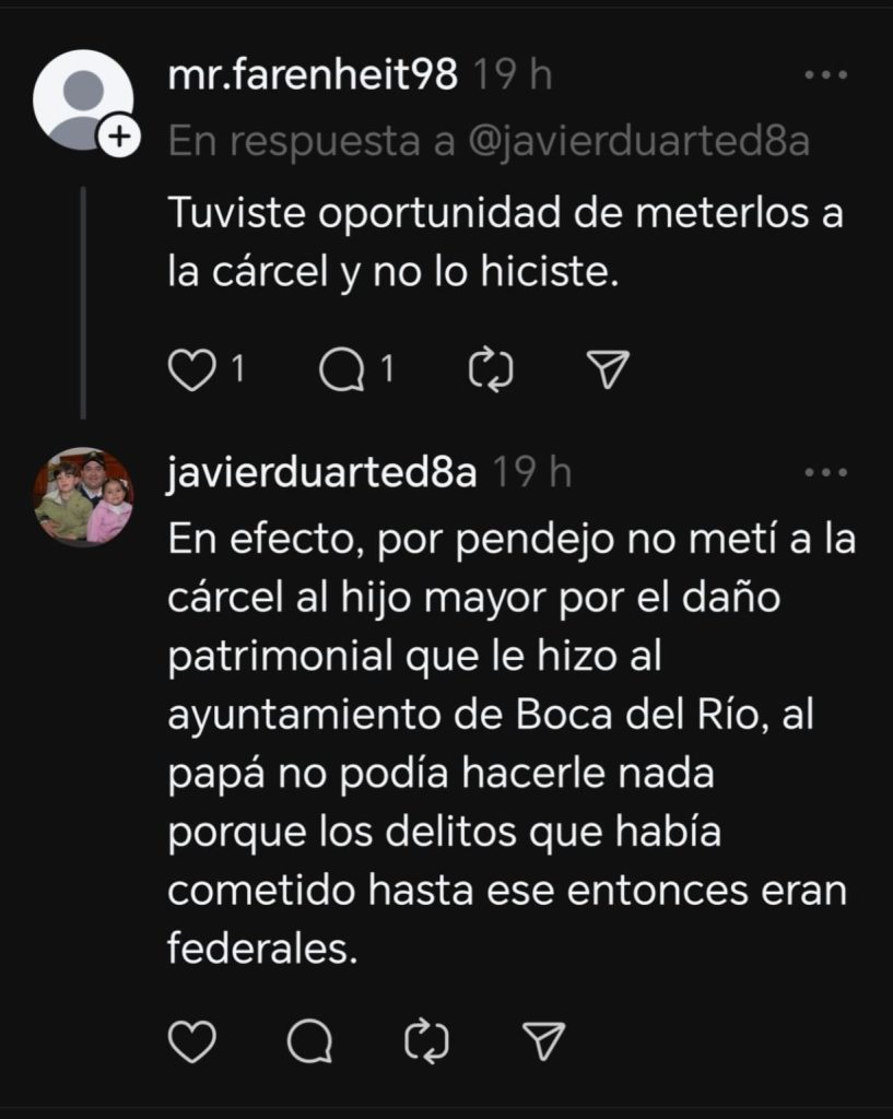 En una de las respuestas dentro de su cuenta Threads Duarte de Ochoa escribió: “En efecto, por pendejo no metí a la cárcel al hijo mayor por el daño patrimonial que le hizo al ayuntamiento de Boca del Río”.