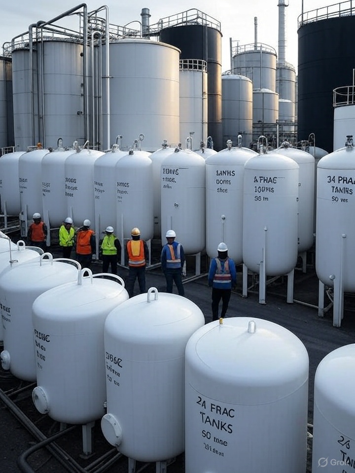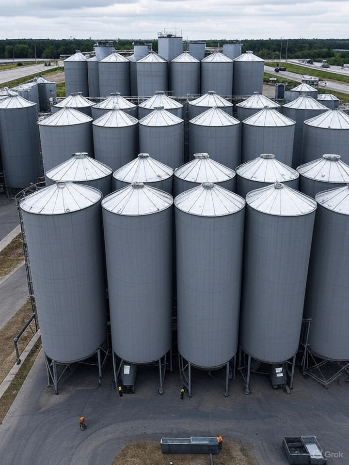 El diseño de la planta contempla un sistema de almacenamiento sofisticado con 15 silos tipo lápiz, cada uno con capacidad de 30 metros cúbicos, y 24 tanques FRAC TANK de 80 metros cúbicos cada uno.