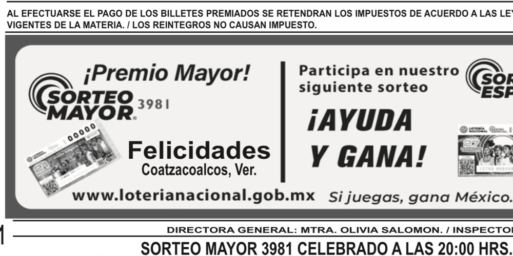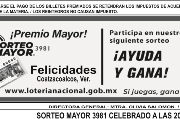 El martes 5 de agosto de 2025, un premio mayor de siete millones de pesos fue ganado en Coatzacoalcos mediante el Sorteo Mayor número 3981 de la Lotería Nacional.