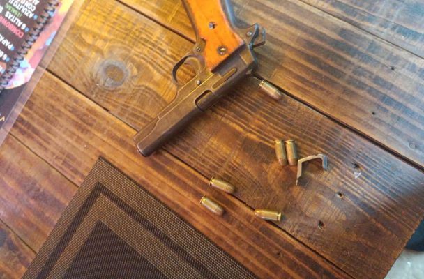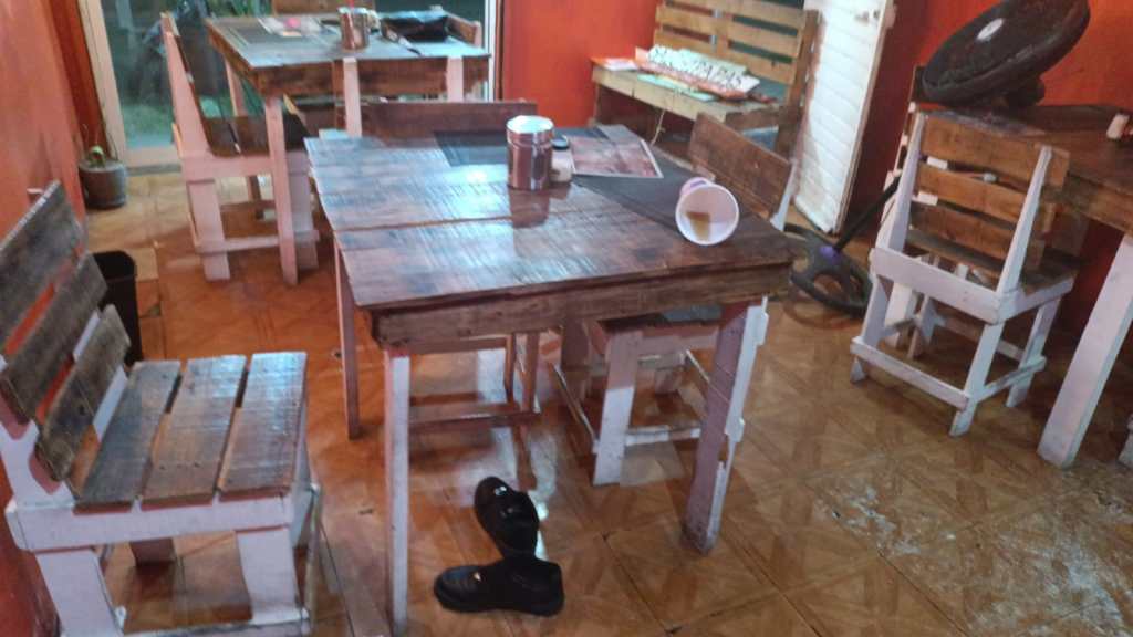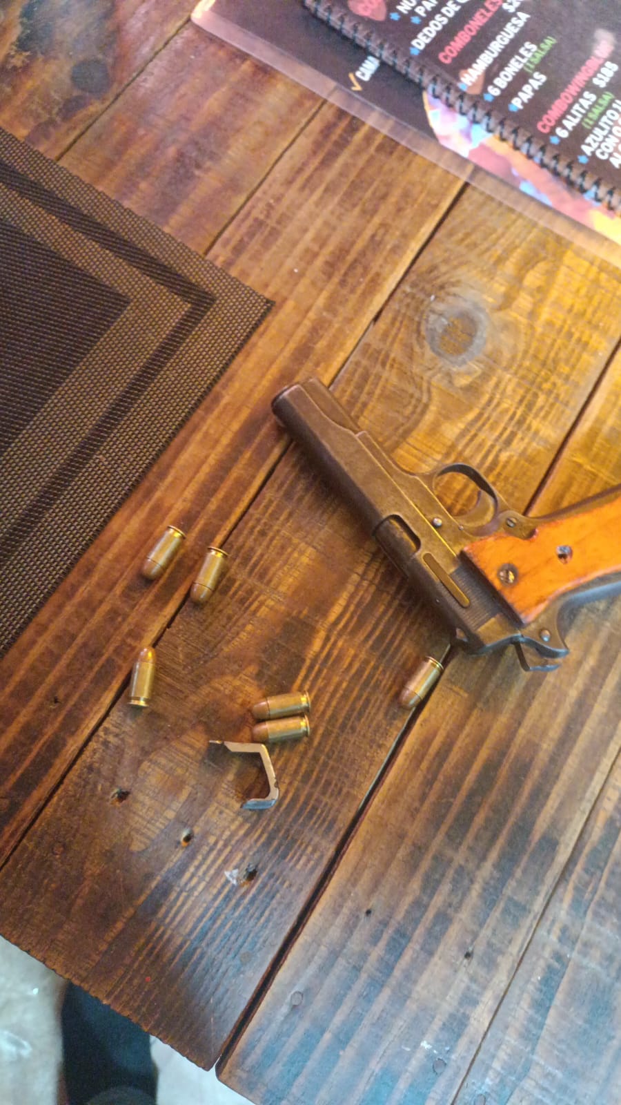 Durante el forcejeo, le arrojaron una silla y lo sometieron, aunque el asaltante logró escapar dejando abandonada su pistola con cartuchos útiles, así como una bolsa tipo bandolera o mariconera.