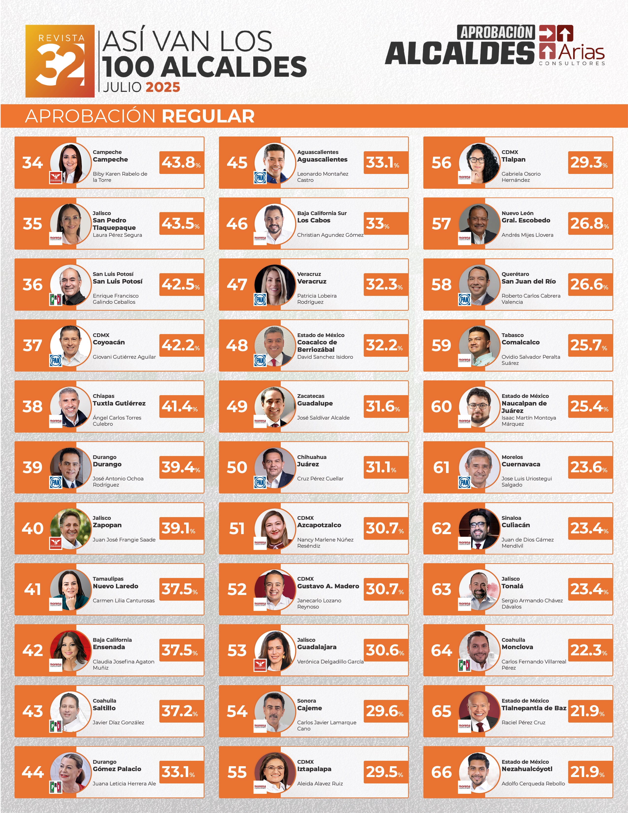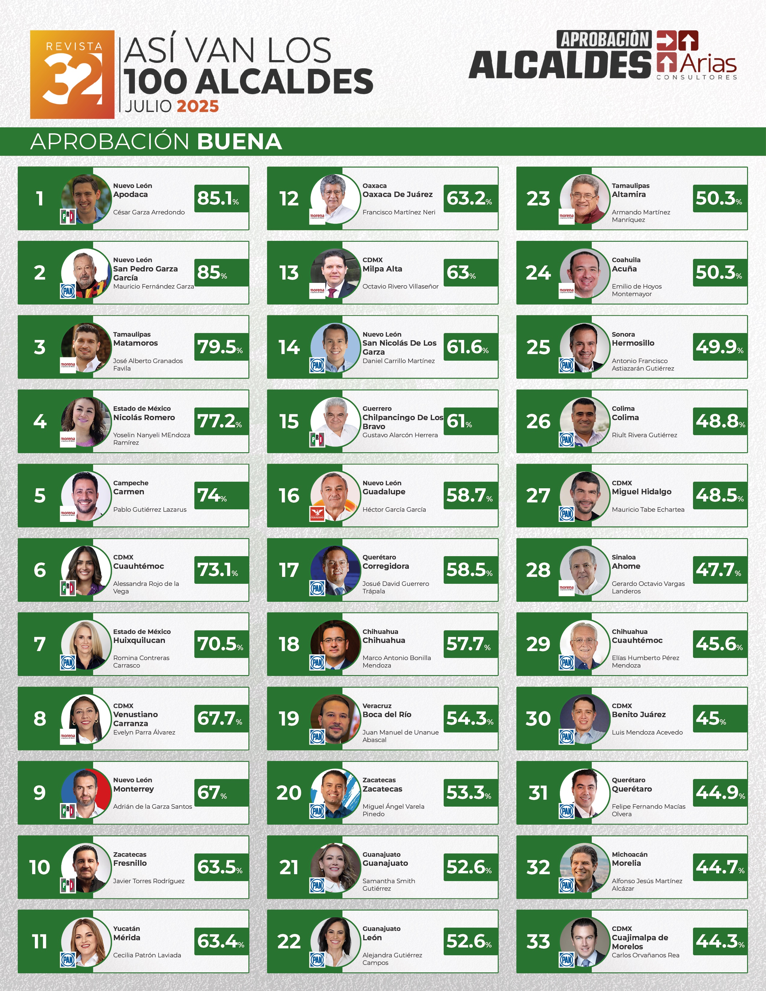 La encuesta de Arias Consultores no solo evidenció a los alcaldes con peores evaluaciones, sino que también destacó a los municipios con mejor gestión y aceptación ciudadana. En este grupo sobresalen los alcaldes del PRI y PAN, quienes lideran la aprobación ciudadana en el país.