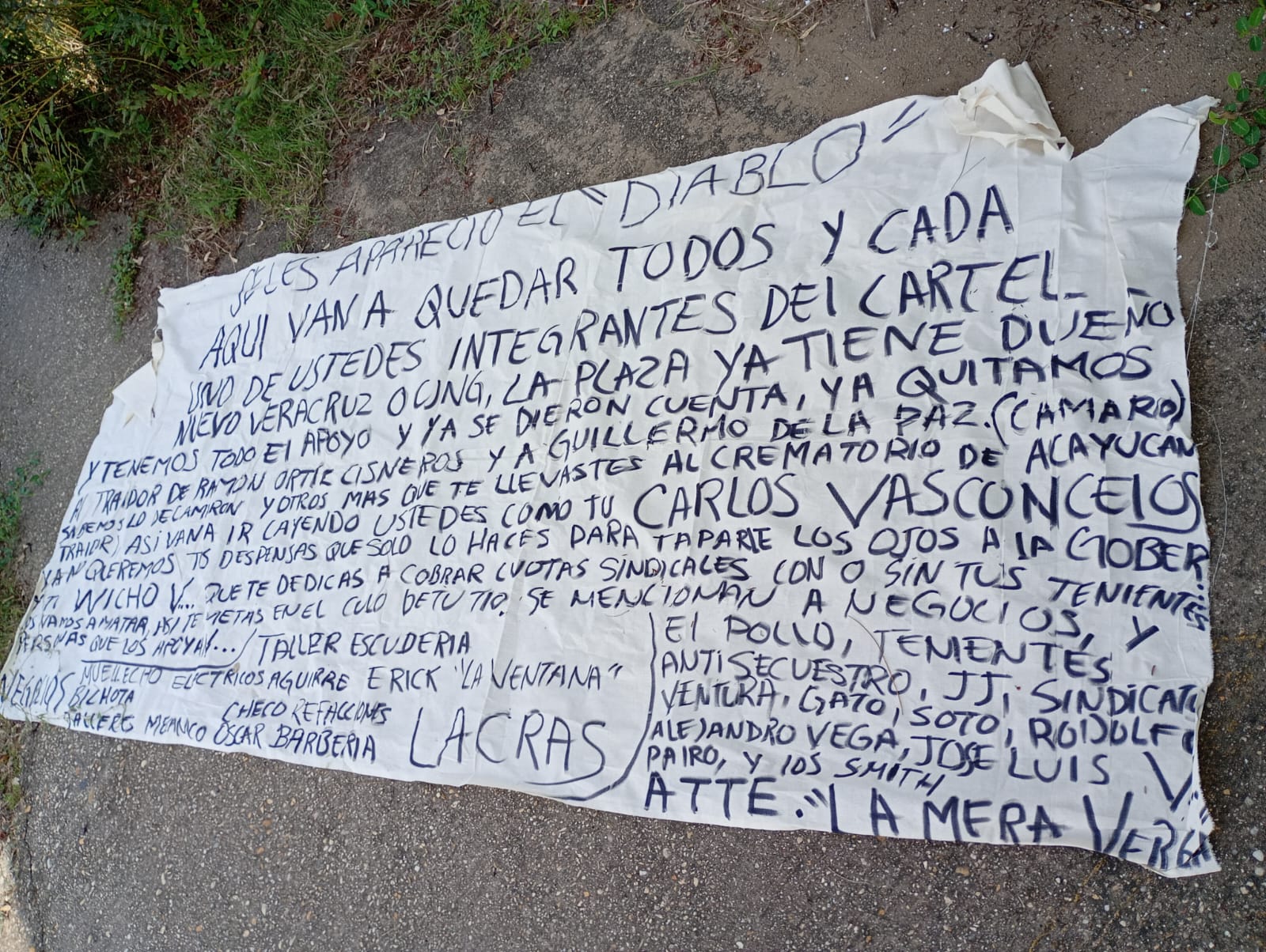 AQUI VAN A QUEDAR TODOS Y CADA UNO DE USTEDES INTEGRANTES DEL CARTEL NUEVO VERACRUZ O CJNG, LA PLAZA YA TIENE DUEÑO Y TENEMOS TODO EL APOYO Y YA SE DIERON CUENTA,YA QUITAMOS AL TRAIDOR DE RAMÓN ORTIZ CISNEROS Y A GUILLERMO DE LA PAZ (CAMARO) SABEMOS LO DEL CAMARON Y OTROS MAS QUE TE LLEVASTES AL CREMATORIO DE ACAYUCAN (TRAIDOR) ASI VANA IR CAYENDO USTEDES COMO TÚ CARLOS VASCONCELOS YA NO QUEREMOS TUS DESPENSAS QUE SOLO LO HACES PARA TAPARLE LOS OJOS A LA GOBER. Y TU WICHO V…. QUE TE DEDICAS A COBRAR CUOTAS SINDICALES CON O SIN TUS TUS TENIENTES LOS VAMOS A MATAR ASI TE METAS EN EL CULO DE TU TIO. SE MENCIONAN A NEGOCIOS, Y PERSONAS QUE LOS APOYAN… NEGOCIOS TALLER ESCUDERIA MUELLECHO ELECTRICOS AGUIRRE ERICK “LA VENTA” BICHOTA CHECO REFACCIONES TALLERES MECANICO, OSCAR BARBERIA LACRAS