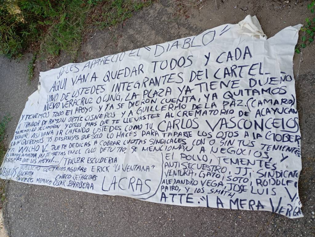 Una manta con un mensaje apareció la mañana de este jueves en la banqueta de la entrada de la Expo Feria de Coatzacoalcos, cerca del panteón Colinas de Paz en la colonia Fovissste. El hallazgo ocurrió mientras se llevaba a cabo un evento escolar en el recinto.