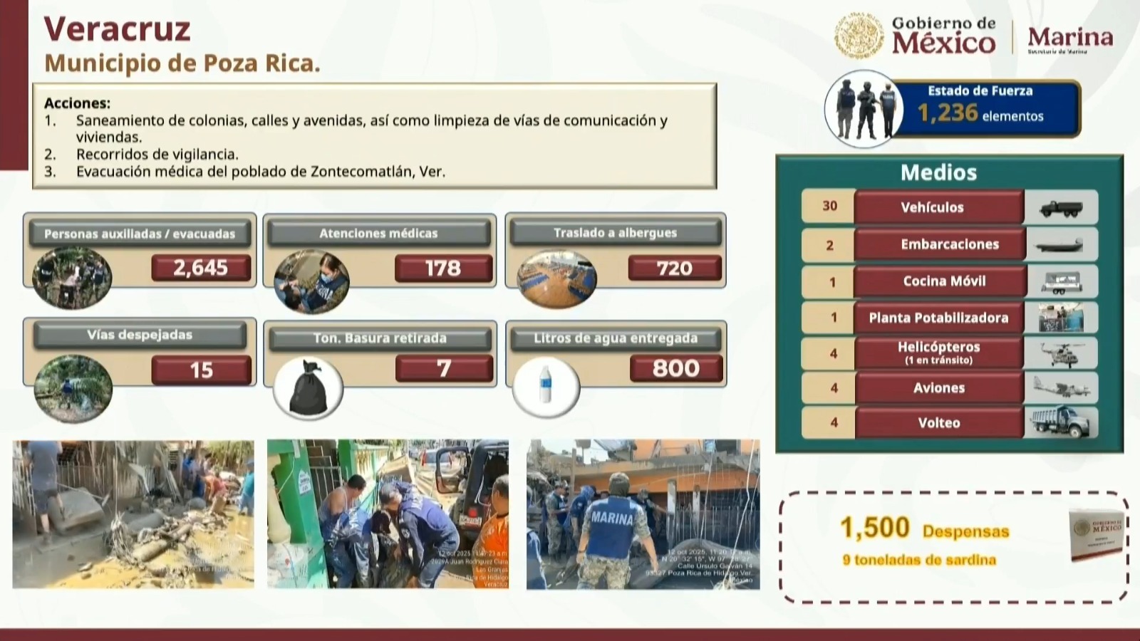 Además, operan 8 plantas potabilizadoras de agua en Poza Rica, Pánuco y Tempoal, junto con dos cocinas móviles (en Poza Rica y Álamo) y una cocina industrial instalada también en Poza Rica.