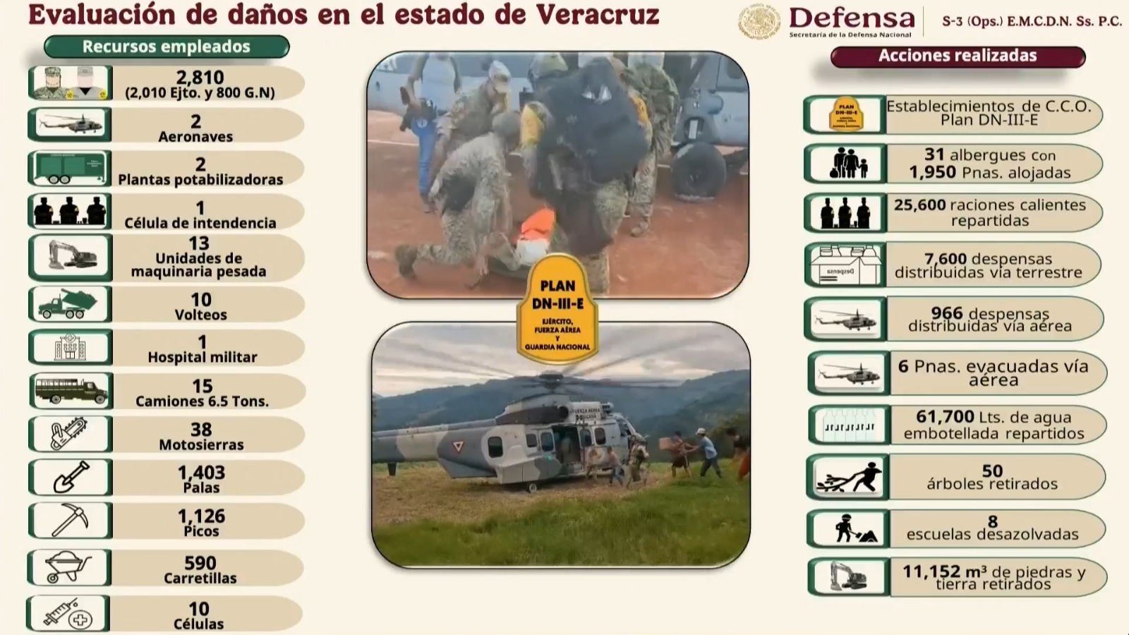 En la zona norte permanecen activos los planes DN-III-E, Marina y Tajín, principalmente en los márgenes de los ríos Cazones, Pantepec y Moctezuma, así como en áreas impactadas por los escurrimientos provenientes de estados vecinos.