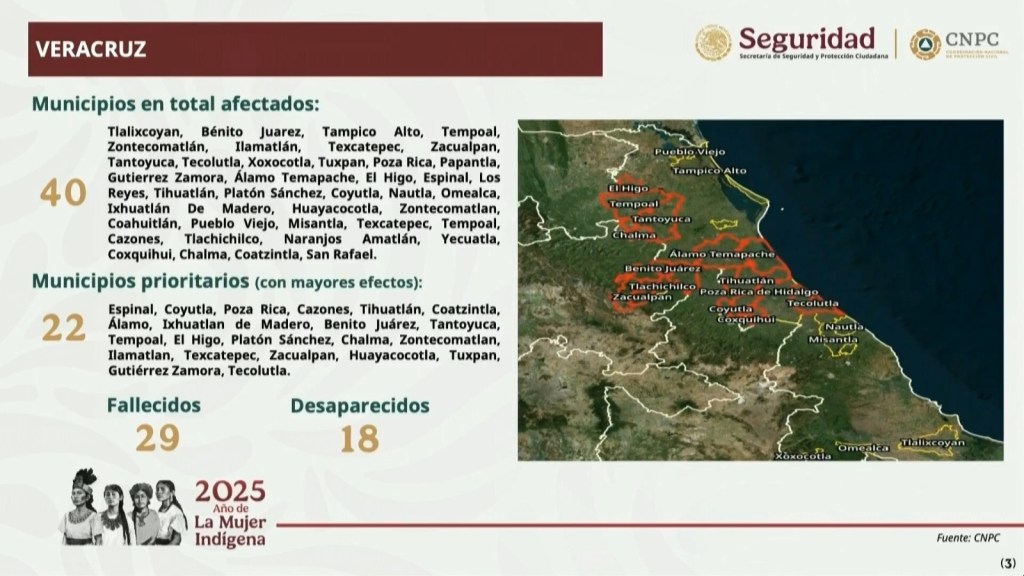 Al corte, se reportan 40 municipios con afectaciones, de los cuales seis permanecen incomunicados, lo que representa 81 comunidades sin acceso terrestre y 24 caminos cerrados. Para garantizar el apoyo, se han establecido cuatro puentes aéreos en la sierra de Huayacocotla, operados con ocho helicópteros de la Federación y del Estado.