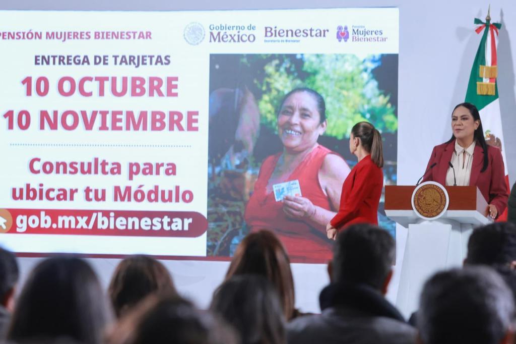 En la conferencia matutina: “Las mañaneras del pueblo”, que encabeza la Presidenta de México, Claudia Sheinbaum Pardo, la secretaria de Bienestar, Ariadna Montiel Reyes, informó que al momento se han entregado un millón 349 mil 462 tarjetas de la Pensión Mujeres Bienestar a mexicanas entre 60 y 64 años que recibirán un apoyo bimestral de 3 mil pesos.