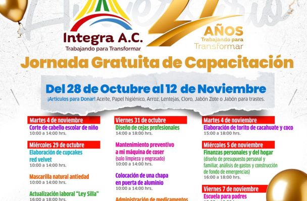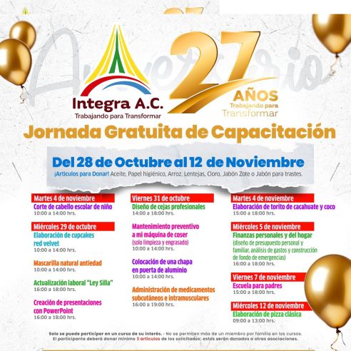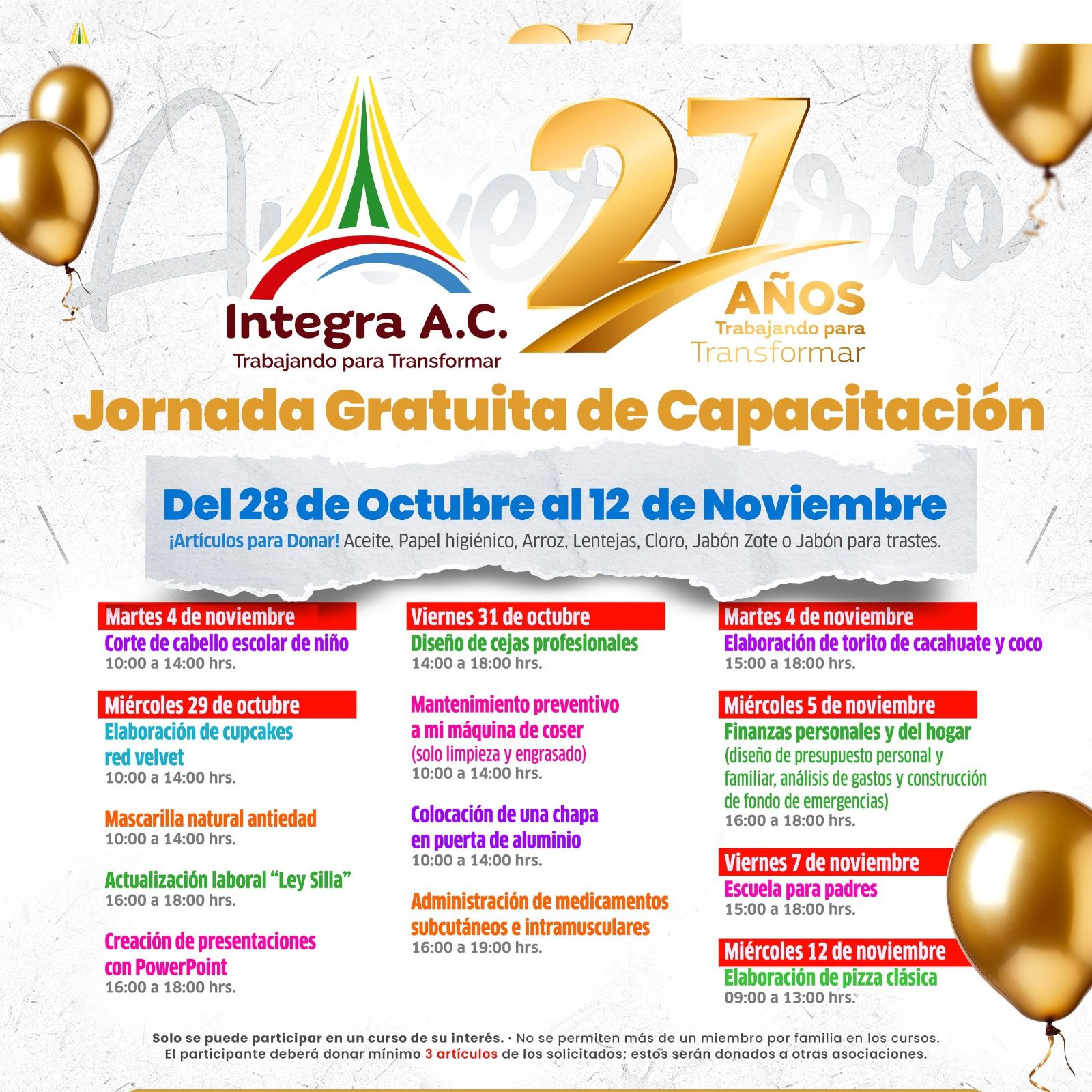 Coatzacoalcos, Ver. Con motivo de su 27º aniversario, la asociación civil Integra por Coatzacoalcos A.C. anunció la realización de su Jornada Gratuita de Capacitación, que se llevará a cabo del 28 de octubre al 12 de noviembre en sus instalaciones ubicadas en Av. Lázaro Cárdenas 714, Col. María de la Piedad.