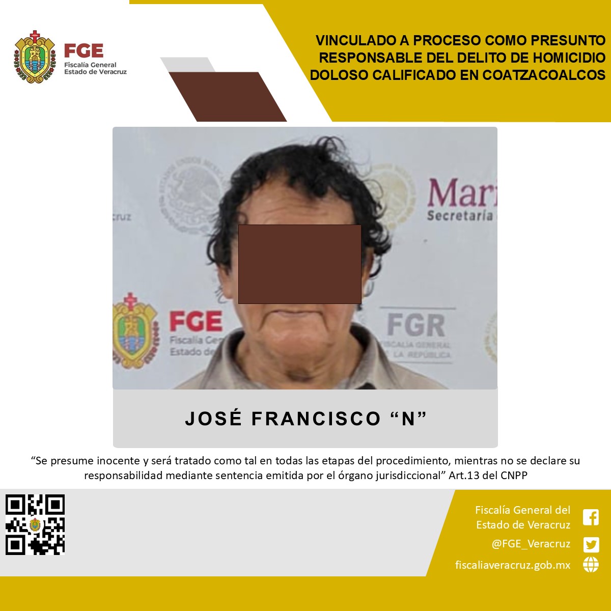 La Fiscalía Regional Coatzacoalcos obtuvo vinculación a proceso en contra de José Francisco “N” como presunto responsable del delito de homicidio doloso calificado en agravio de la víctima identificada con las iniciales A.M.V.