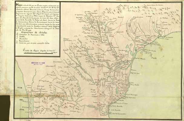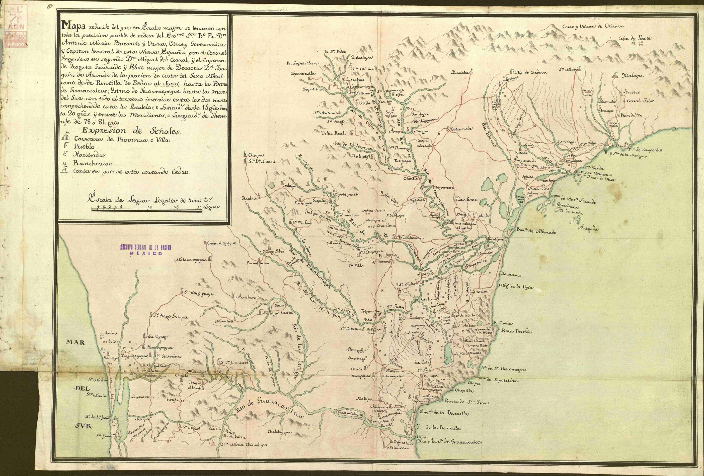 «Mapa reducido del que en escala mayor se levantó con toda la precisión posible del orden de Antonio María Bucareli, virrey governador y capitán general de la Nueva España por el Coronel Ingeniero en Segundo Don Miguel del Corral y el Capitán de Fragata Graduado y Piloto Mayor Don Joaquín de Arandou de la porción de costa del seno mexicano desde Puntilla de Piedras hasta la Barra de Guazacoalcos; Ystmo de Tecoatepegue hasta las mar del sur con todo el terreno interior entre los dos mares.»