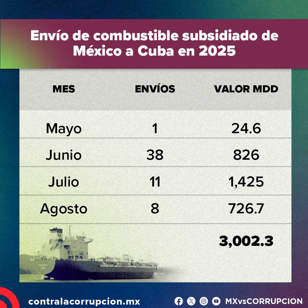 Desde el 13 de octubre, MCCI reveló que los envíos de combustible subsidiado a Cuba se habían disparado en el gobierno de Claudia Sheinbaum, al exportar en el segundo cuatrimestre del año hidrocarburos por más de 3 mil millones de dólares -tres veces los 1 mil millones de dólares enviados por AMLO entre julio de 2023 a septiembre de 2024- y empleando incluso al buque Sandino, sancionado desde 2019 por Estados Unidos.