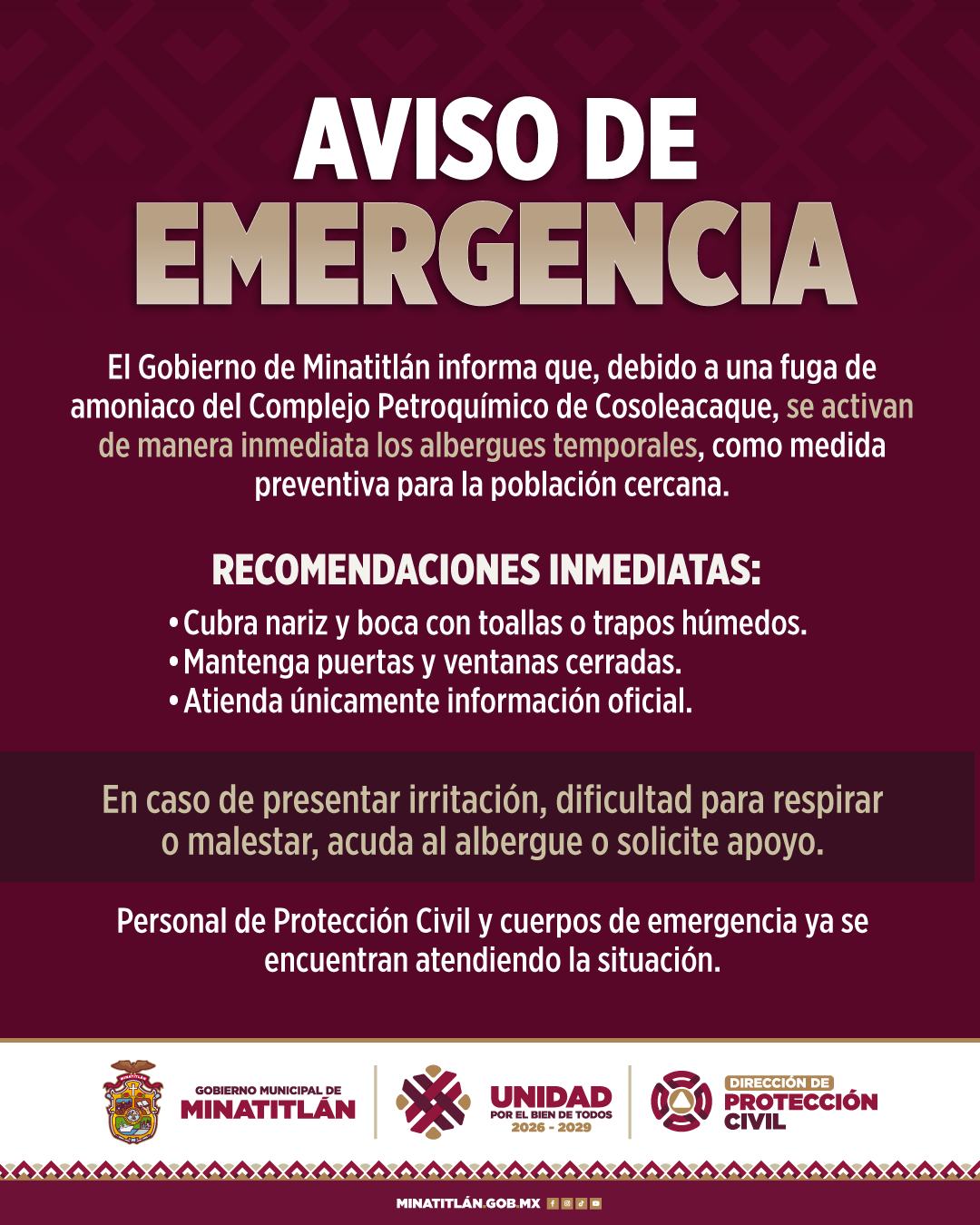 El Gobierno de Minatitlán informa que, ante la fuga de amoniaco registrada en el Complejo Petroquímico de Cosoleacaque, se ha activado de manera inmediata los albergues temporales como medida preventiva para la población cercana.