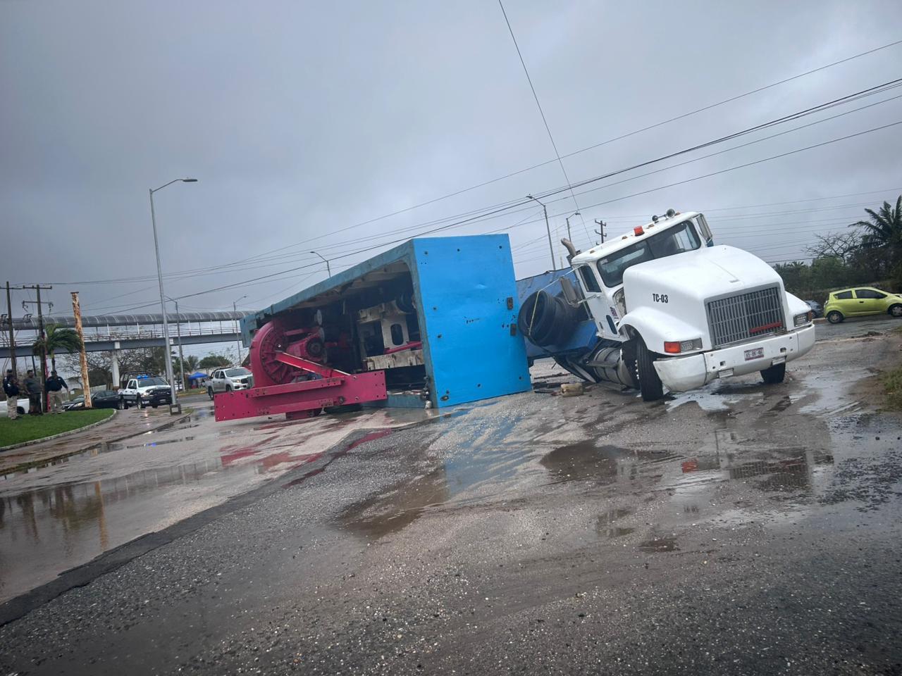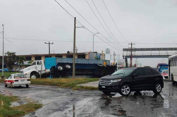 Al pasar justo enfrente del tecnológico de esta ciudad, el chófer hizo corte de circulación hacia su izquierda pero el peso lo venció y volcó la caja en la cual transportaba maquinaria pesada.