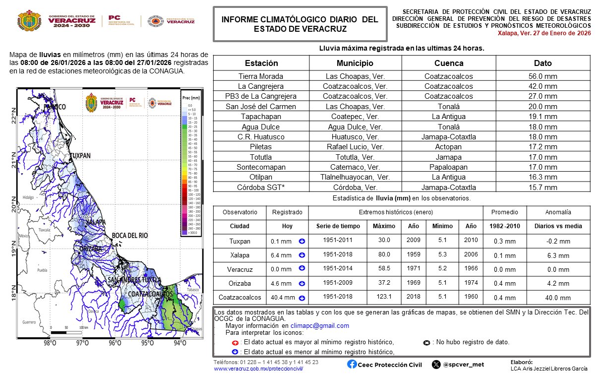 En las últimas 24 horas, con corte a las 08:00 horas, se registraron precipitaciones moderadas a fuertes, con los acumulados más altos concentrados en la región de Coatzacoalcos y Las Choapas, donde el «caudal caído del cielo» ha generado alerta por posibles inundaciones.