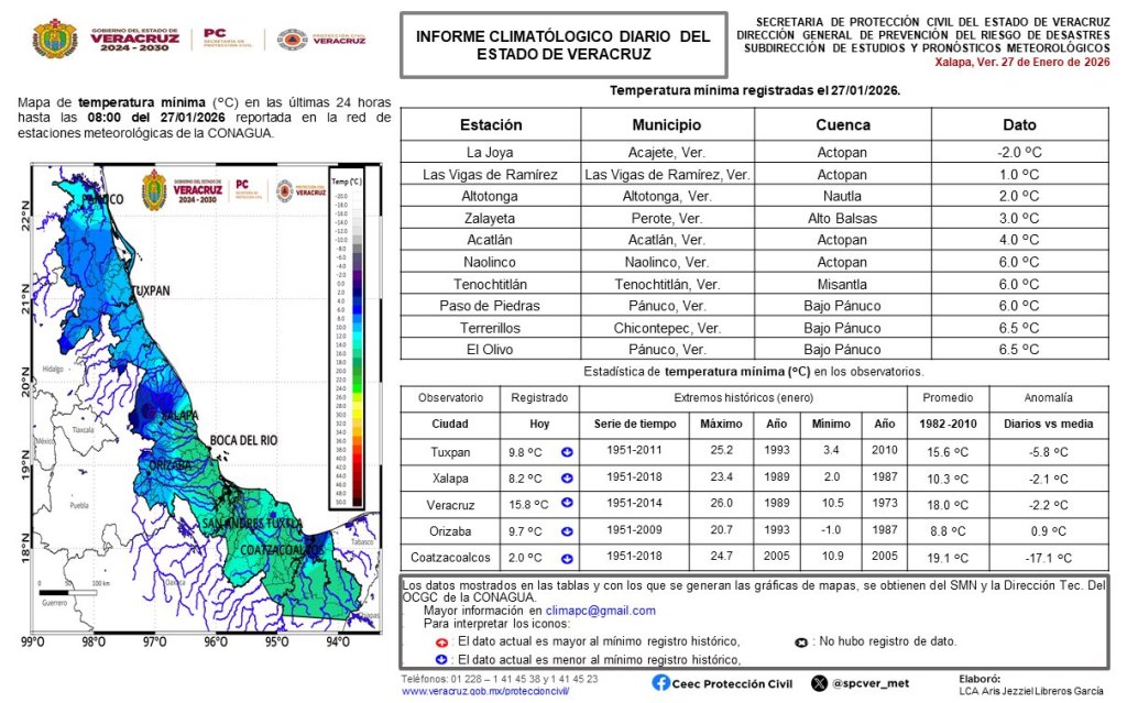 En contraste, las zonas de altas montañas sufren lo peor de la onda gélida: La Joya, en Acajete, descendió hasta -2 grados Celsius, mientras que Las Vigas, Naolinco y Altotonga oscilan entre 1 y 2 grados.