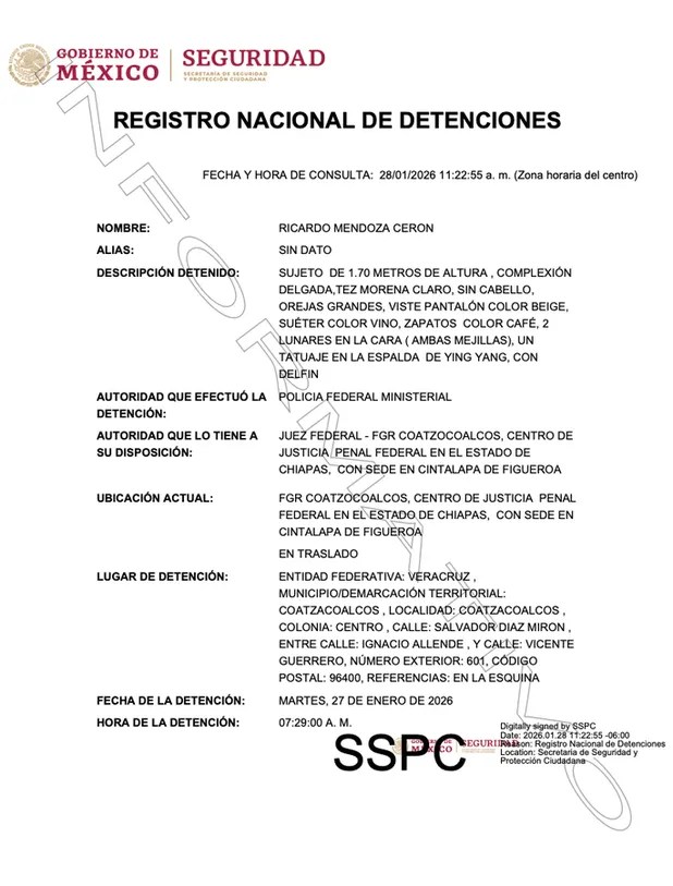 Elementos de la Fiscalía General de la República (FGR) detuvieron en la colonia Centro de esta ciudad, sobre la avenida Díaz Mirón, entre Allende y Guerrero, a Ricardo Mendoza Cerón, despachador del Ferrocarril del Istmo de Tehuantepec (FIT).