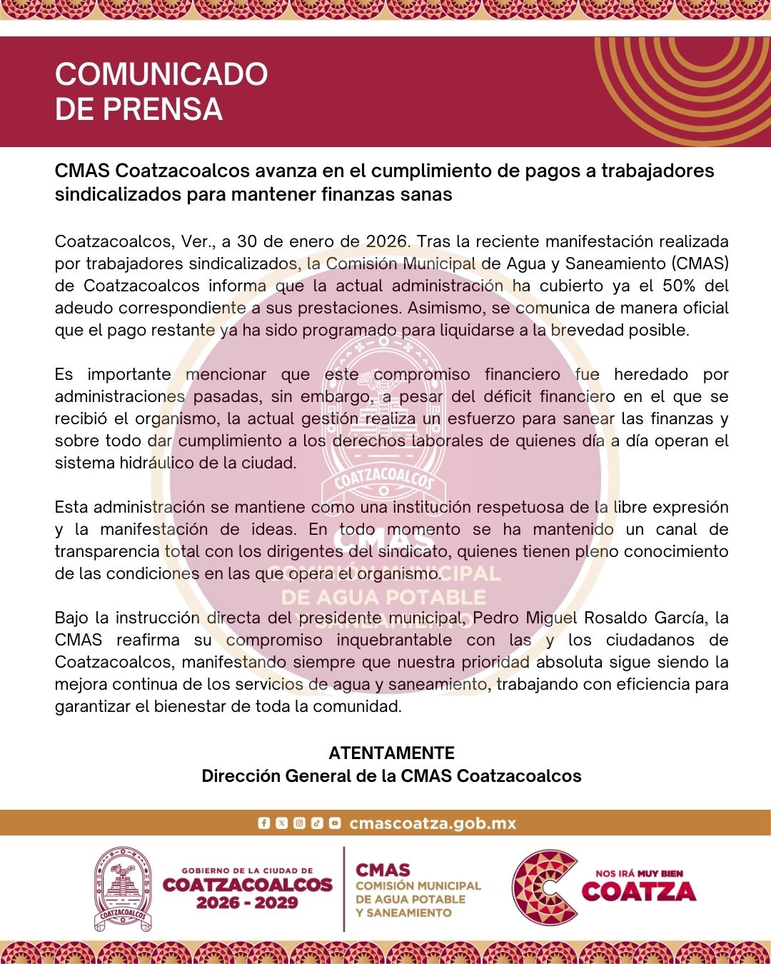 Tras la reciente manifestación realizada por trabajadores sindicalizados, la Comisión Municipal de Agua y Saneamiento (CMAS) de Coatzacoalcos informa que la actual administración ha cubierto ya el 50% del adeudo correspondiente a sus prestaciones. Asimismo, se comunica de manera oficial que el pago restante ya ha sido programado para liquidarse a la brevedad posible.