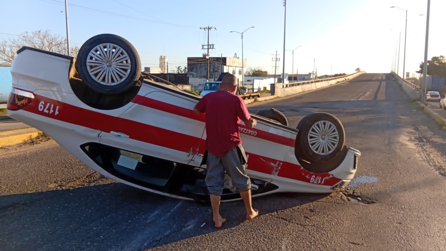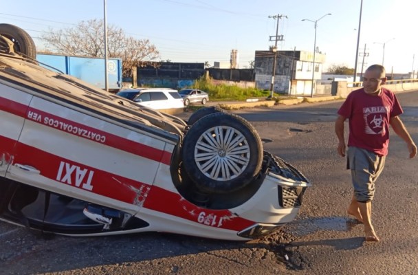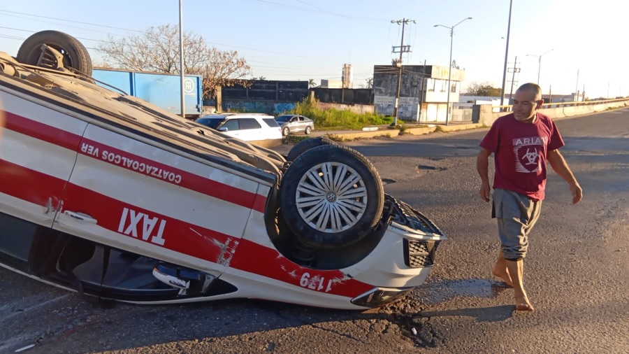 Un taxista resultó con diversos golpes y cuantiosos daños materiales tras volcar la unidad que conducía la tarde de este lunes 2 de febrero sobre la carretera Transístmica, a la altura de la central camionera de Coatzacoalcos.