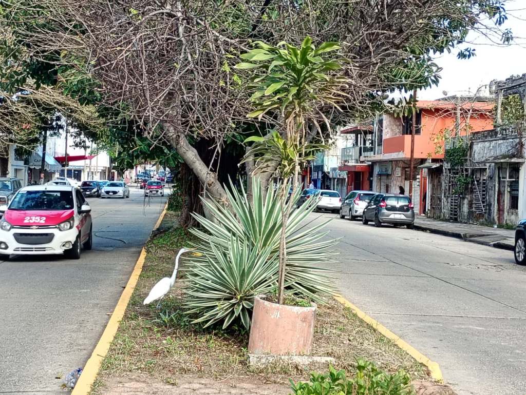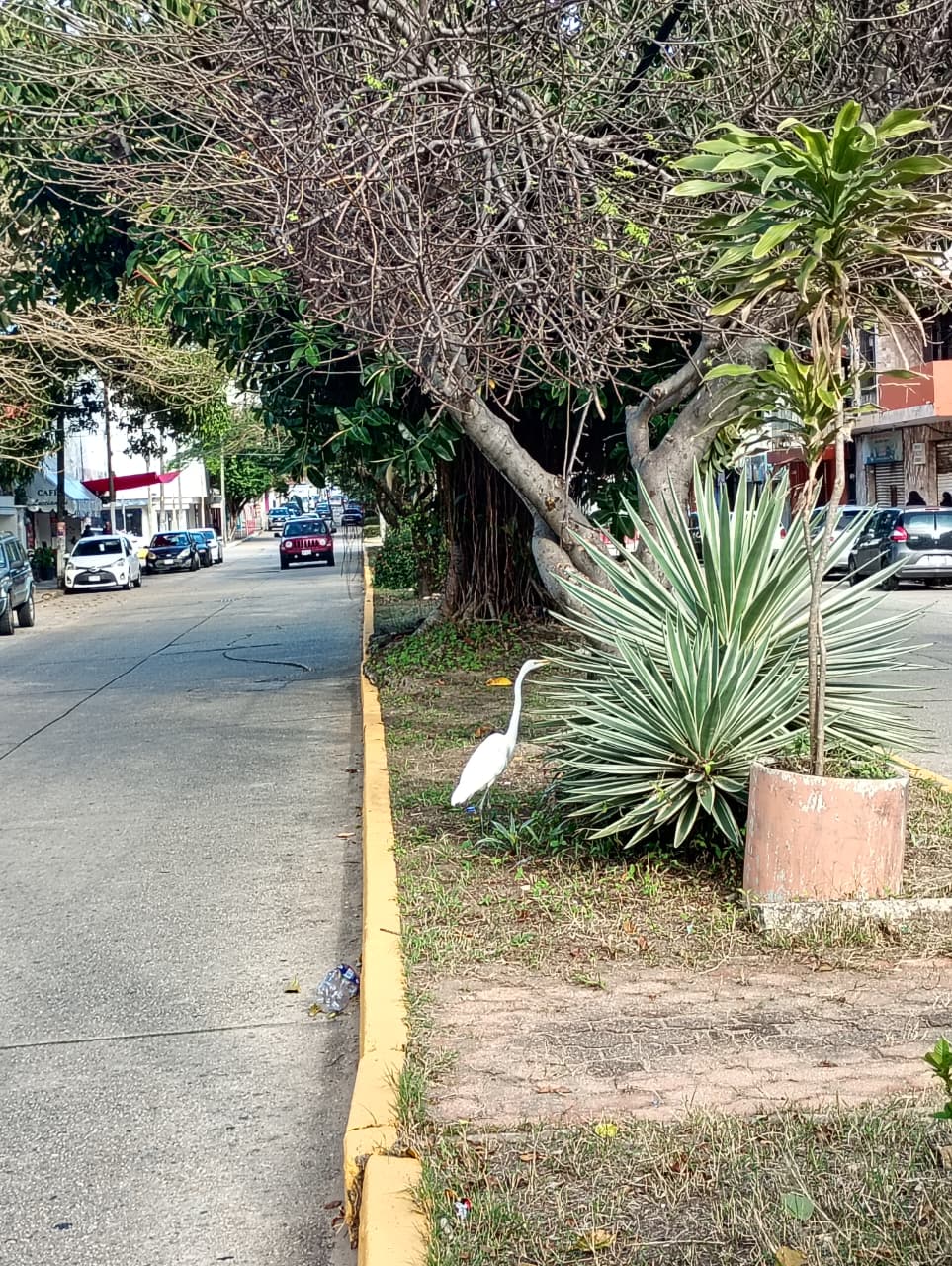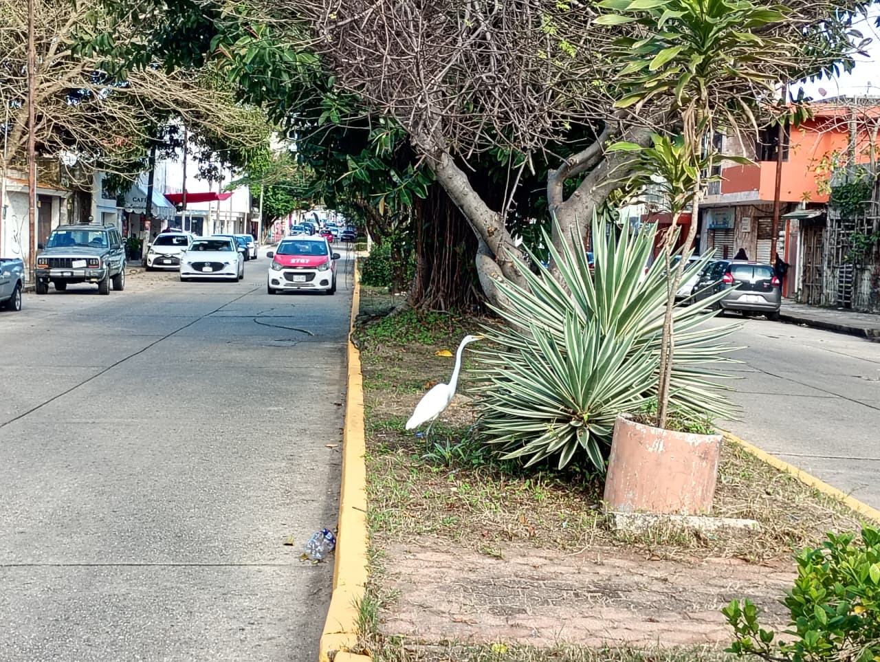 Durante la tarde del pasado lunes, una garza blanca (Ardea alba), conocida también como garza grande o garceta grande, apareció en la zona centro de Coatzacoalcos, picoteando arriates con basura en la avenida Juárez, entre Allende y 16 de septiembre.