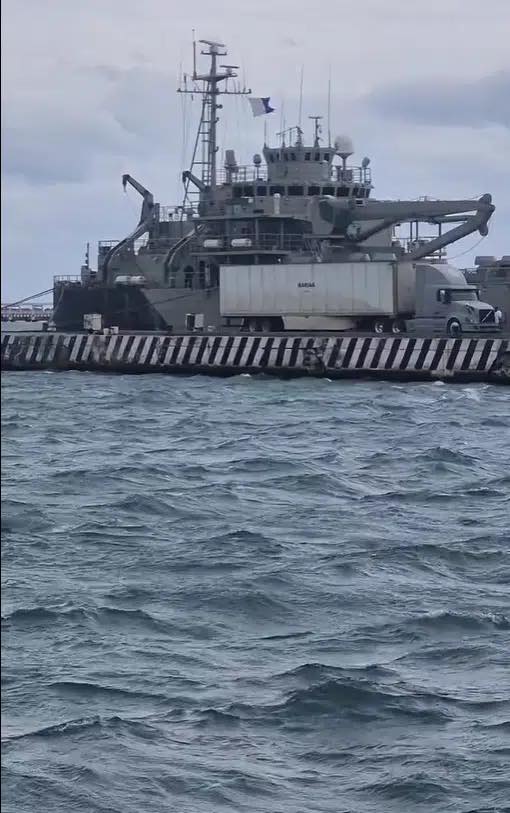 Tráileres de carga arribaron esta mañana a la zona del Muro de los Pescadores con despensas y productos básicos diversos. Marinos federales resguardan las embarcaciones grises y suben las cajas de alimentos a bordo, en preparación para el envío anunciado por la Presidencia de la República.