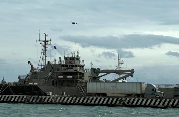 Personal de la Secretaría de Marina-Armada de México (Semar) carga suministros alimenticios en los buques Papaloapan e Isla Holbox, anclados en el puerto de Veracruz, como parte de una misión de ayuda humanitaria hacia Cuba, según reportes de testigos y autoridades portuarias.