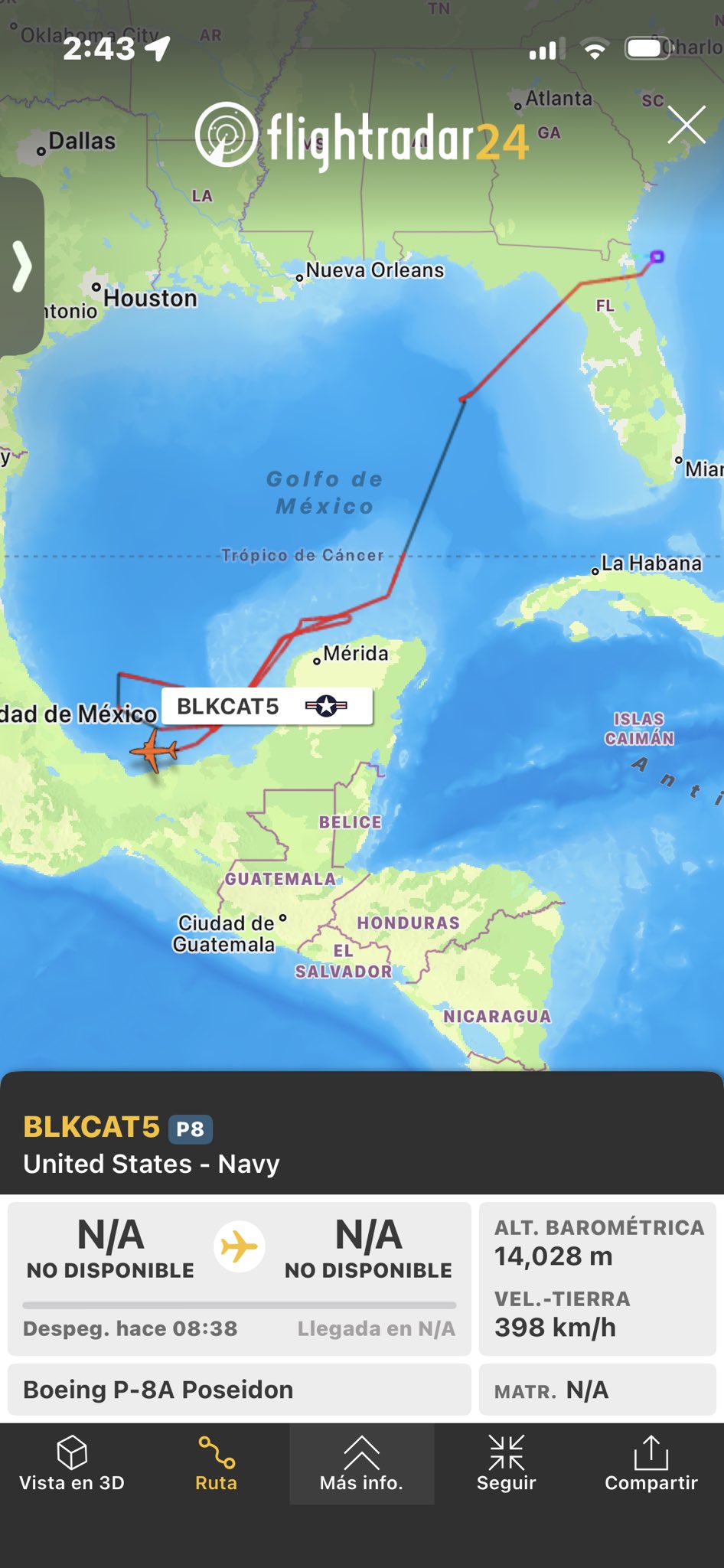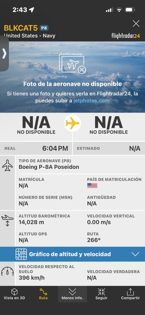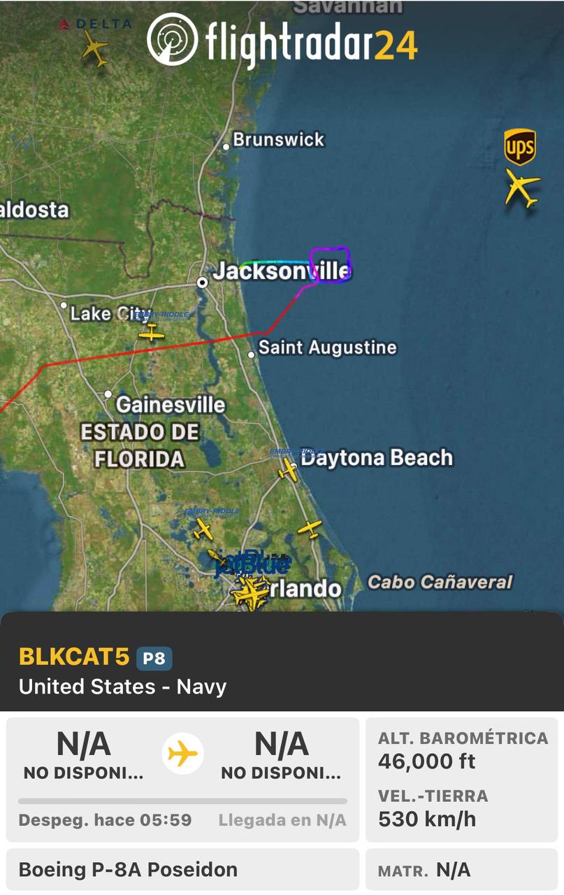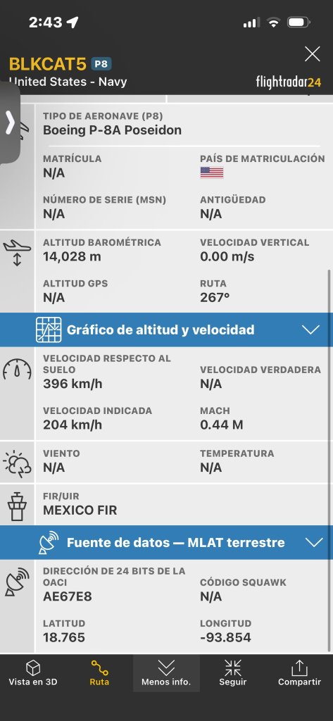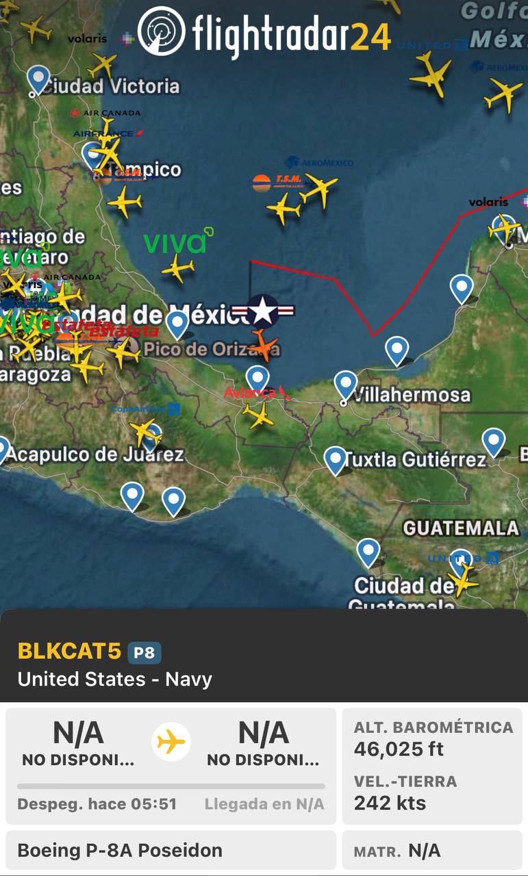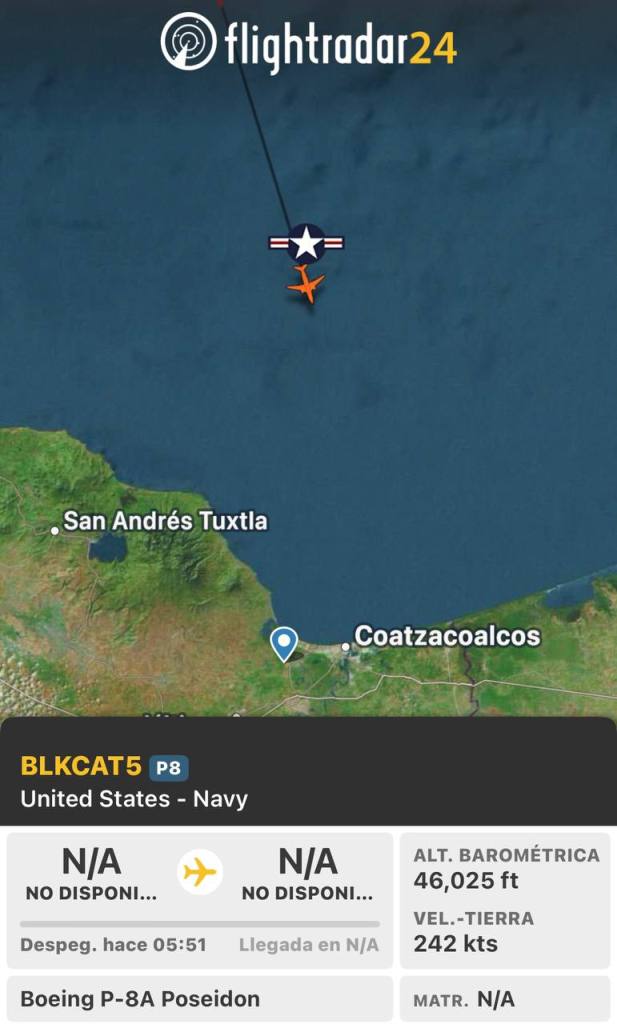 Un avión de patrulla marítima Boeing P-8A Poseidon (BLKCAT5) de la Marina de Estados Unidos realizó sobrevuelos esta mañana sobre las costas de Coatzacoalcos y el sur de Veracruz, en aguas del Golfo de México, según datos de inteligencia de fuentes abiertas (OSINT) como Flight Radar e imágenes satelitales.