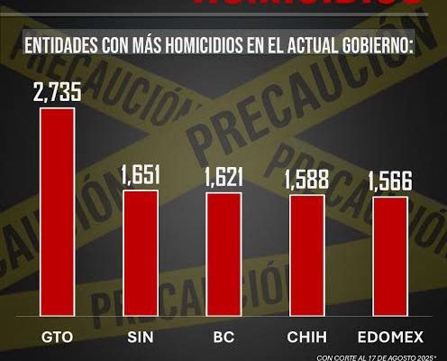 Con base en información oficial federal, la entidad con menos homicidios dolosos durante el año 2025 fue Yucatán, con 33: y la que presenta la mayor cifra es Guanajuato con 2539.