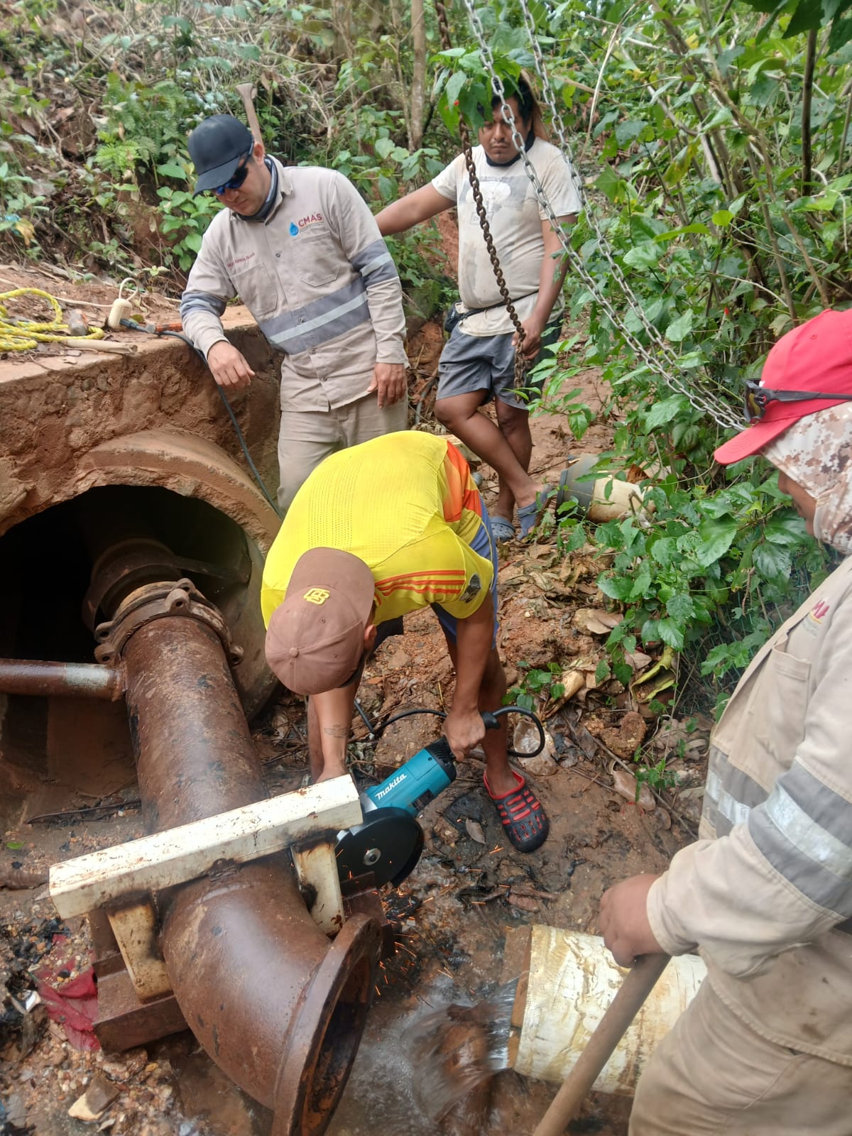 Luego de varios días de intensas labores por parte del personal operativo de la Comisión Municipal de Agua Potable y Saneamiento (CMAS), se ha concluido con éxito la reparación de la línea de 10 pulgadas del Pozo 15, ubicado en la zona de Canticas.