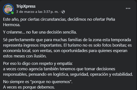 «El turismo no es solo fotos bonitas; es economía local, son ventas, son oportunidades», resalta el comunicado de TripXpress, que priorizó la seguridad y la logística por encima de los ingresos esperados.