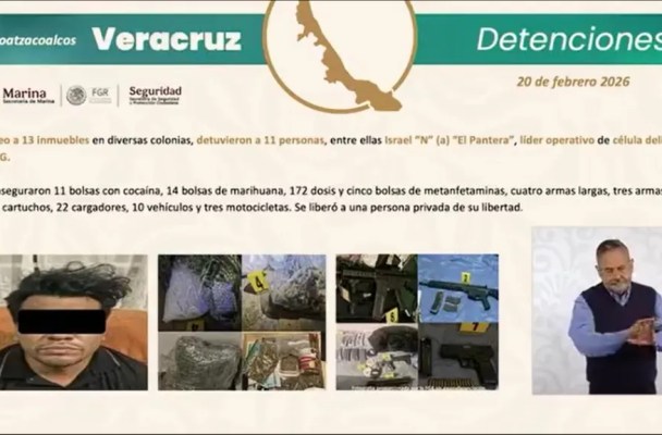 En Coatzacoalcos, Veracruz, las fuerzas federales de seguridad capturaron a Israel “N”, alias “El Pantera”, líder operativo del Cártel Jalisco Nueva Generación en la región, quien fue asegurado junto a 10 de sus cómplices.