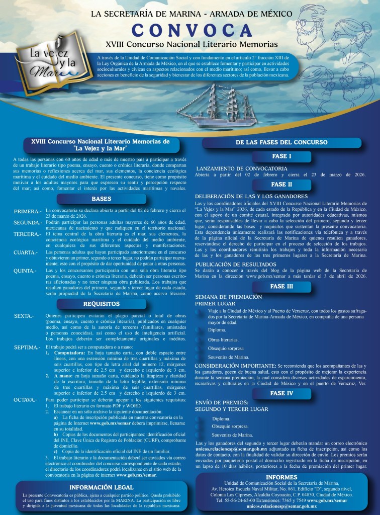 Coatzacoalcos, Ver., 12 de marzo de 2026.- El Gobierno de Coatzacoalcos que preside el alcalde, Pedro Miguel Rosaldo García, invita a las personas con 60 años de edad o más de nuestro municipio a participar en el Concurso Nacional Literario Memorias de «La Vejez y la Mar» 2026 organizado por la Secretaría de Marina-Armada de México.