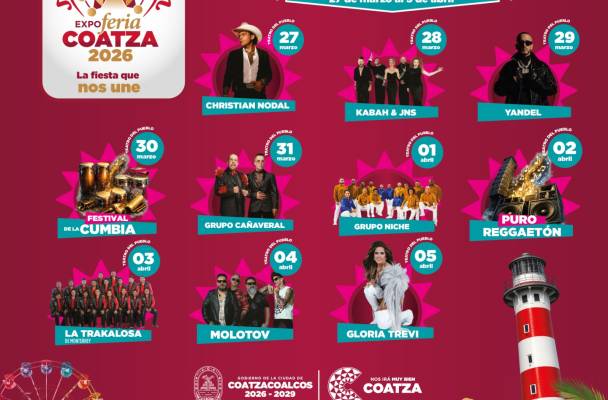 Coatzacoalcos, Ver., 13 de marzo de 2026.- Del 27 de marzo al 5 de abril, se vivirá la “Expo Feria Coatza 2026”, la fiesta más grande del sur de Veracruz, que reunirá a artistas de talla internacional como Christian Nodal, Kabah, JNS, Yandel, La Trakalosa, Molotov y Gloria Trevi, además de talentos locales y regionales, en un programa pensado para todos los gustos y edades.