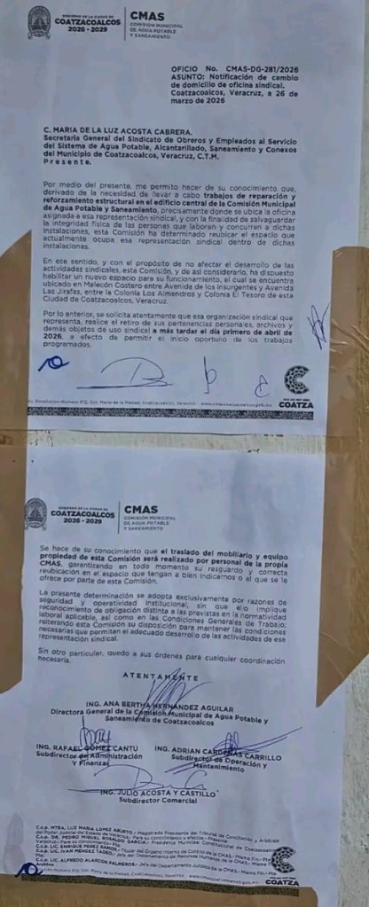 CMAS ordena desalojo inmediato de oficinas sindicales en Coatzacoalcos por trabajos de mantenimiento.
