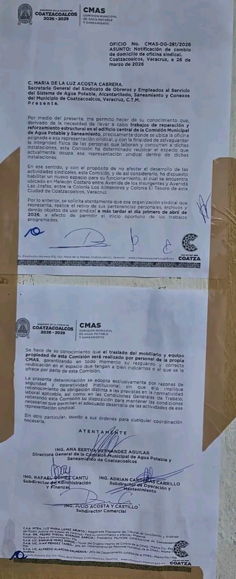 CMAS ordena desalojo inmediato de oficinas sindicales en Coatzacoalcos por trabajos de mantenimiento.