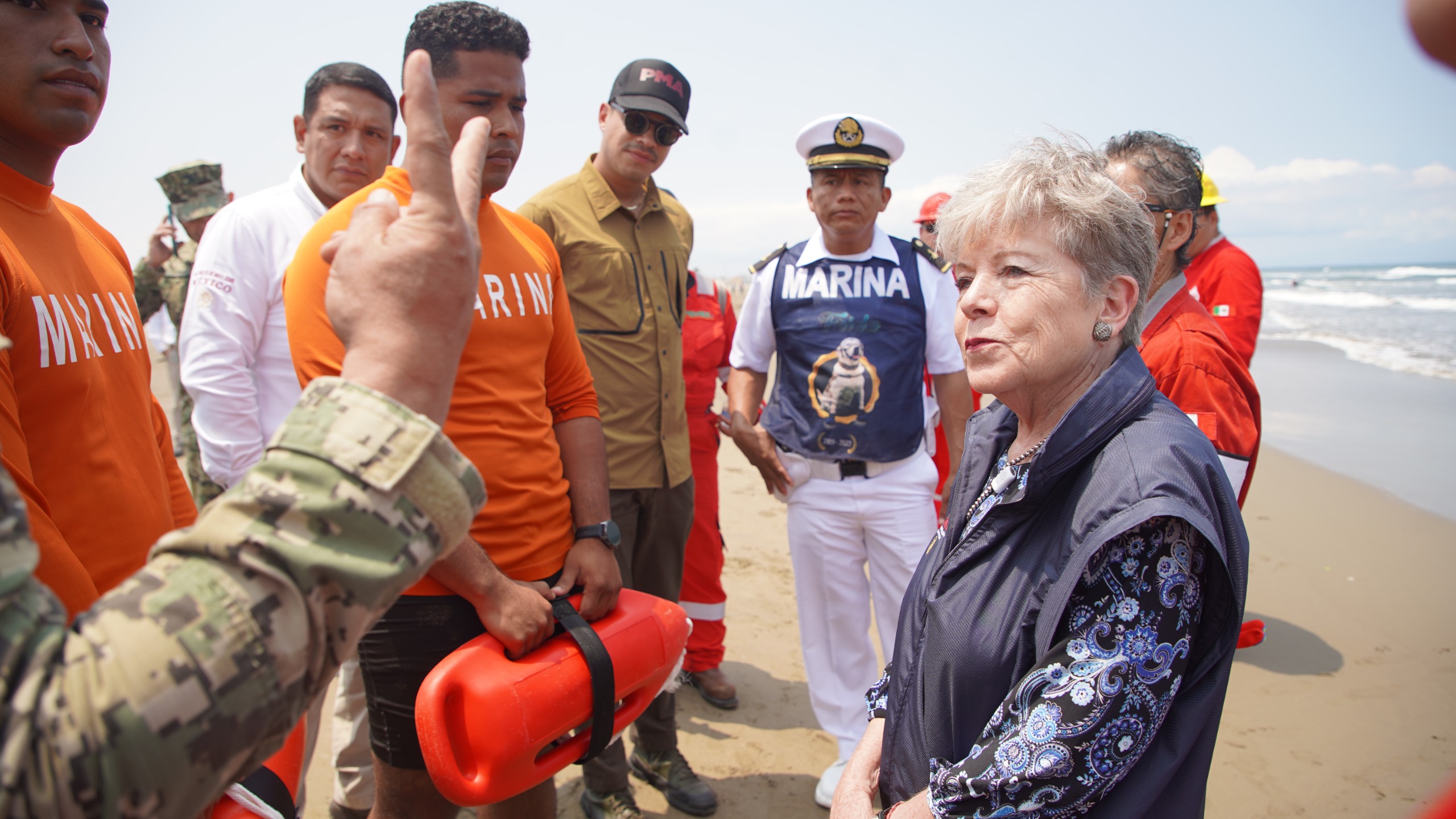 La secretaria de Medio Ambiente y Recursos Naturales, Alicia Bárcena Ibarra y representantes del Grupo Interinstitucional (GI) realizaron hoy recorridos por tierra y aire en las playas de Veracruz para supervisar los avances en los trabajos de contención, limpieza y monitoreo por la presencia de hidrocarburos en el Golfo de México.