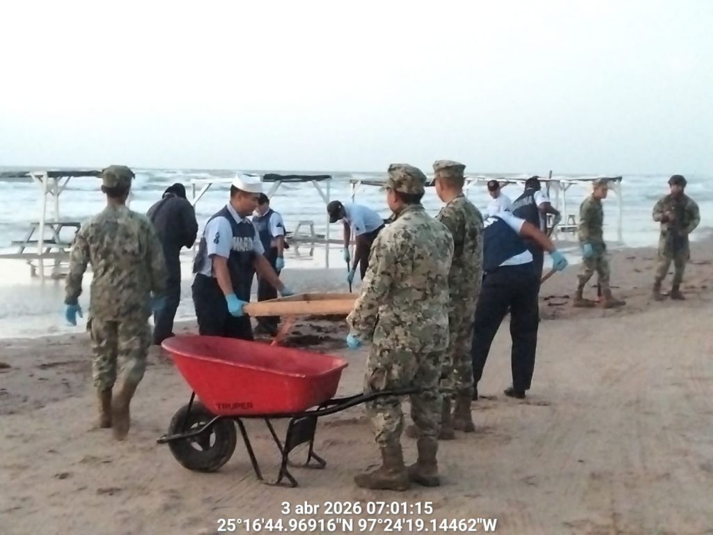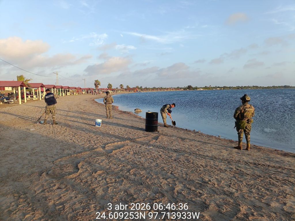 Se mantienen acciones para la contención de hidrocarburo en las costas del estado de Tamaulipas; en este contexto, personal de la Secretaría de Marina hoy recorrió aproximadamente 17 kilómetros en las playas Puerto Morelos (Mezquital) y Costa Azul (Bagdad), donde se recolectaron aproximadamente 236 kilogramos de hidrocarburo.