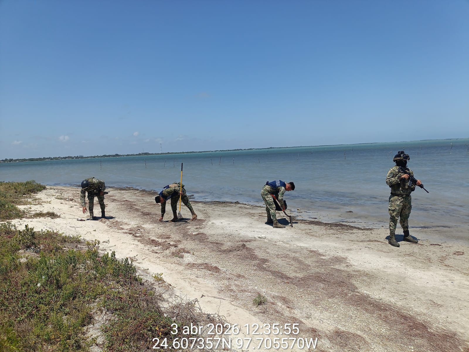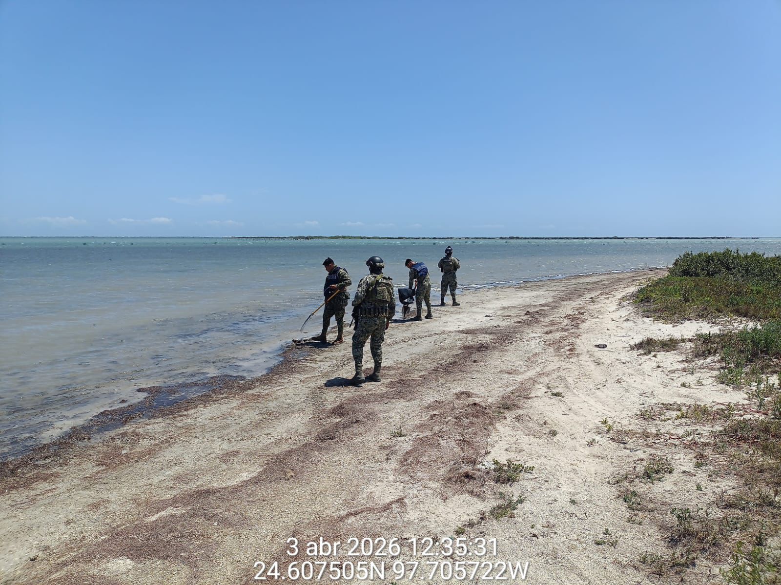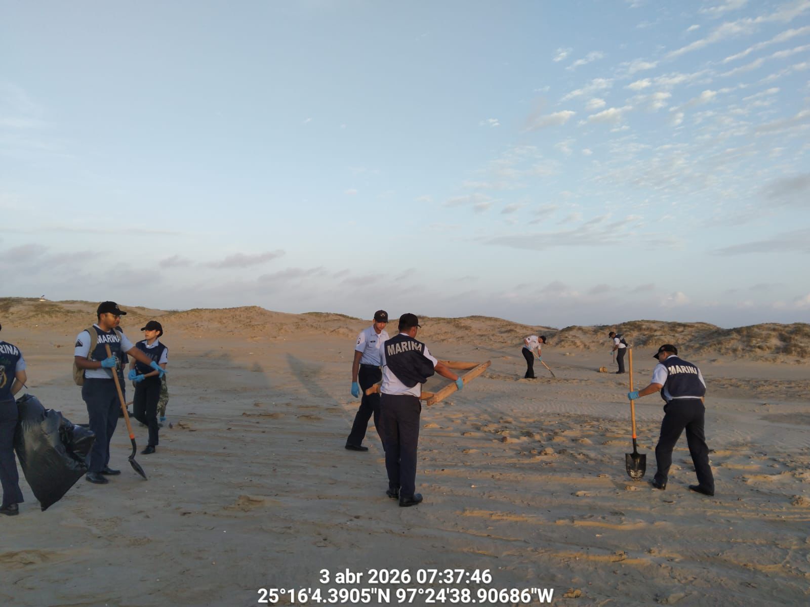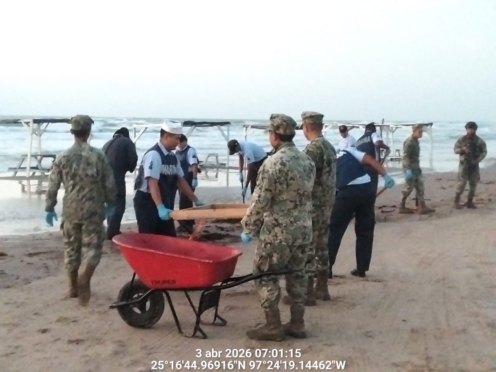 Se mantienen acciones para la contención de hidrocarburo en las costas del estado de Tamaulipas; en este contexto, personal de la Secretaría de Marina hoy recorrió aproximadamente 17 kilómetros en las playas Puerto Morelos (Mezquital) y Costa Azul (Bagdad), donde se recolectaron aproximadamente 236 kilogramos de hidrocarburo.