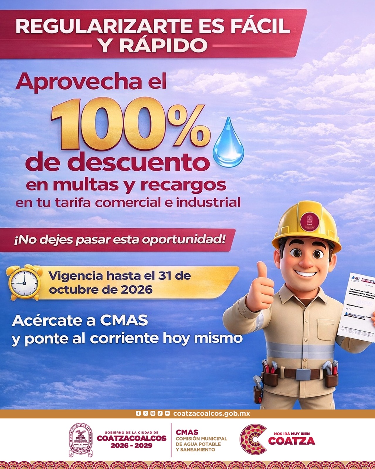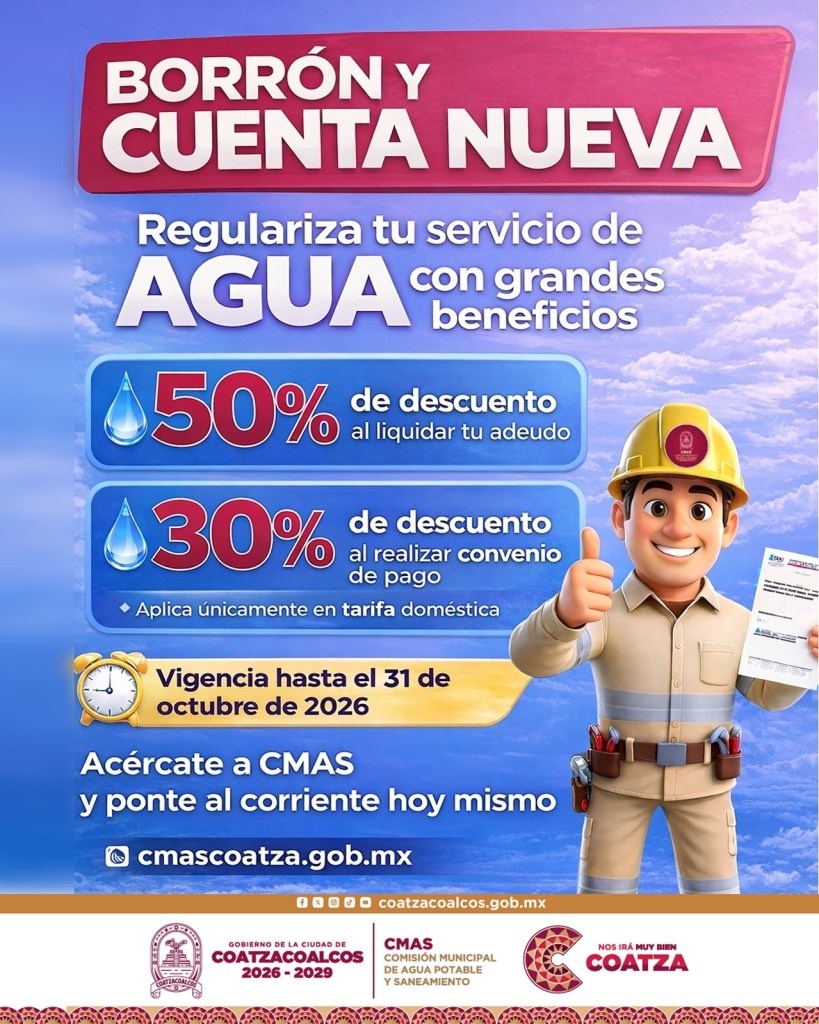 Coatzacoalcos, Ver., a 24 de abril de 2026. A partir de este viernes, la Comisión Municipal de Agua Potable y Saneamiento de Coatzacoalcos (CMAS), lanzó el programa “Borrón y Cuenta Nueva”, una estrategia dirigida a facilitar la regularización de usuarios con adeudos en su servicio, mediante importantes beneficios económicos.
