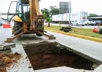 Personal de Obras Públicas, trabaja en socavón del Boulevard Institutos Tecnológicos Se utiliza en las maniobras maquinaria pesada para encontrar las causas que originaron el nacimiento…